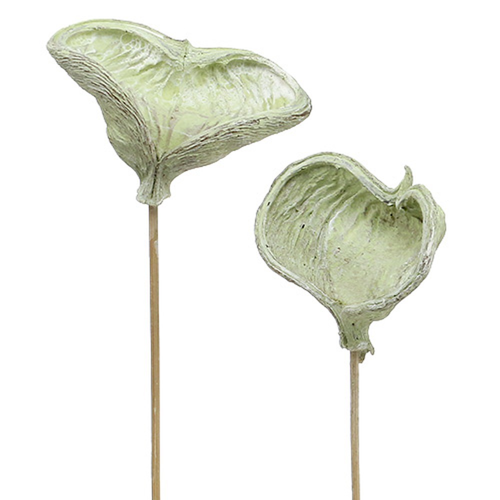 Ganz außergewöhnlich ist diese Naturdeko namens Badam: Die grün gefärbte, weiß gewaschene, getrocknete Schale der Mandelfrucht wurde hier auf einen naturfarbenen, praktischen Holzstiel geklebt. Geerntet wurde die Trockenschale des Mandelbaums, der botanisch als Prunus dulcis bezeichnet wird, und kommt nun in diversen Deko-Bereichen sowie in der Trocken- und Trauerfloristik zum Einsatz.