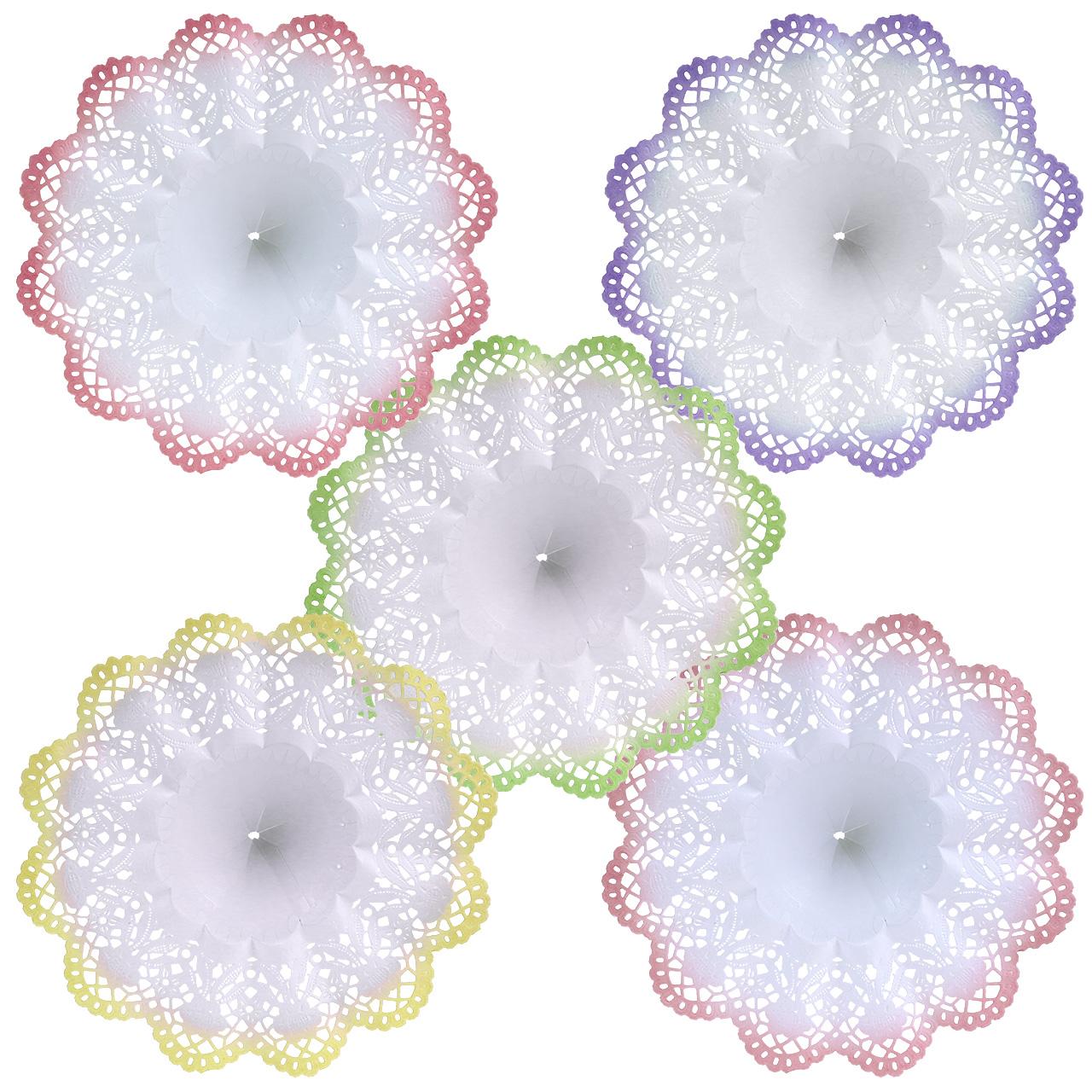Die Batik-Biedermeier-Manschetten, deren Ränder wahlweise in Rosa, Grün, Lila, Gelb oder Altrosa gefärbt sind, werden Ihnen im Set zu 25 Stück in einer Kunststoff-Verpackung geliefert. Der Außendurchmesser jeder Manschette beträgt circa 24 Zentimeter; beim Innendurchmesser sind es ungefähr 10 Zentimeter.