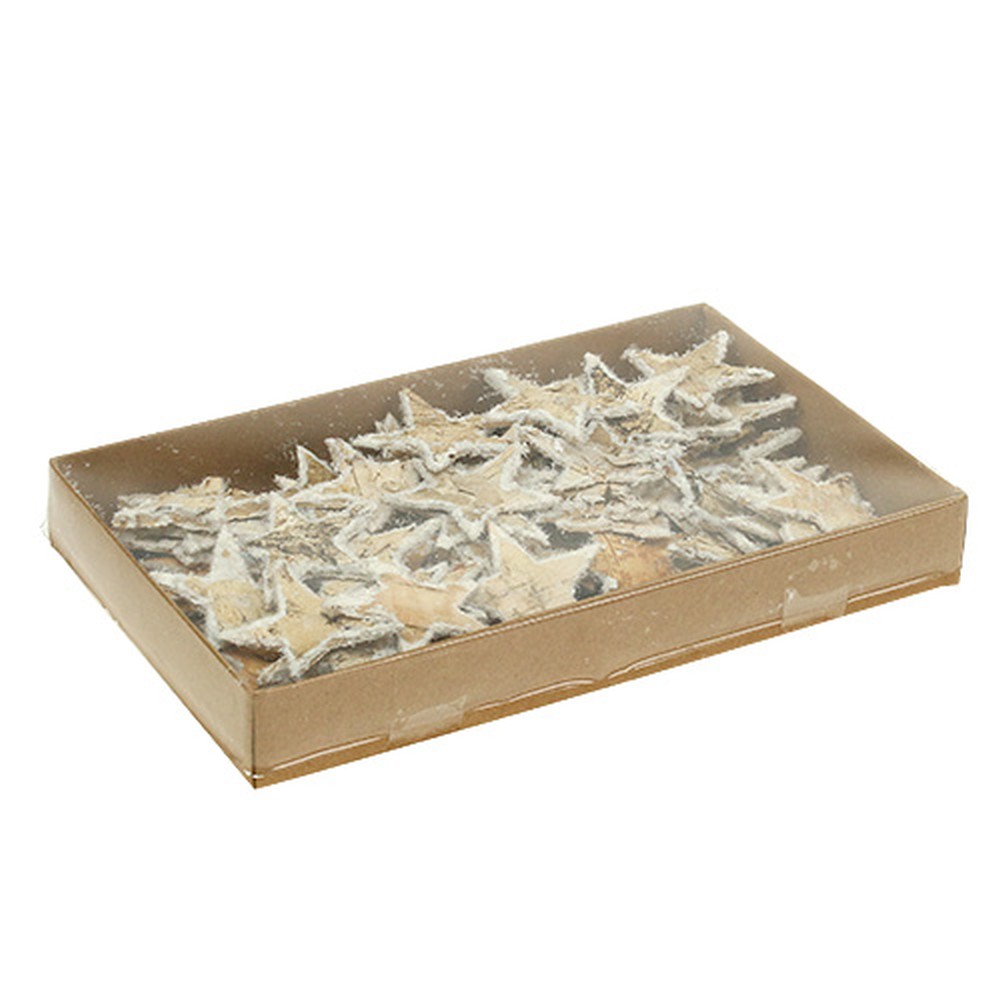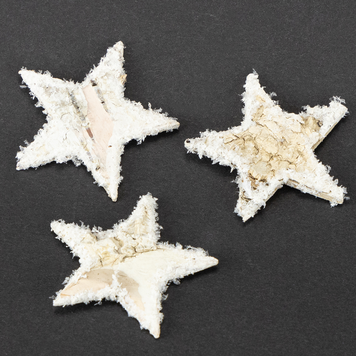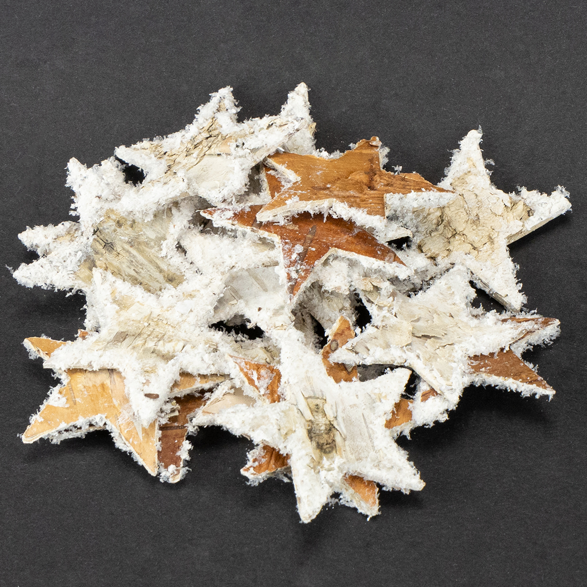 Die beschneiten Birkensterne in Ihren Naturfarben befinden sich in einer Box zu insgesamt 60 Stück und sind alle circa 4 Zentimeter groß. Die Oberfläche variiert und hat stets andere Muster zu bieten, wie es in der Natur üblich ist.