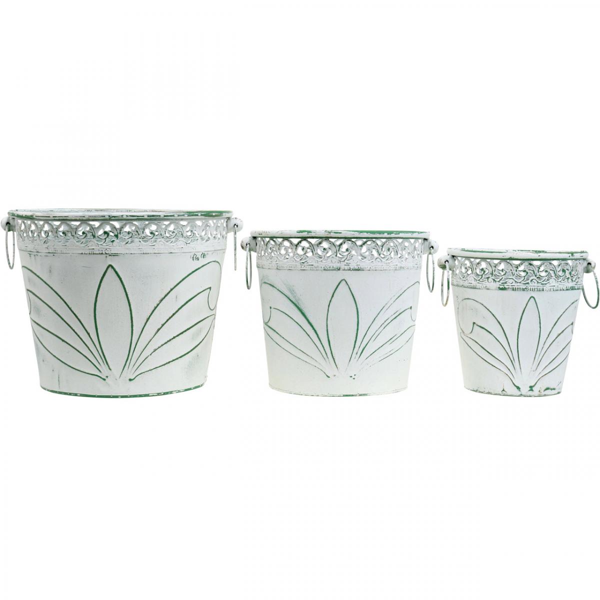 Blech-Kübel mit Prägung, Pflanzgefäß mit Henkeln Weiß, Grün Shabby Chic H22/19,5/17,5cm Ø25,5/20,5/15,5cm 3er-Set