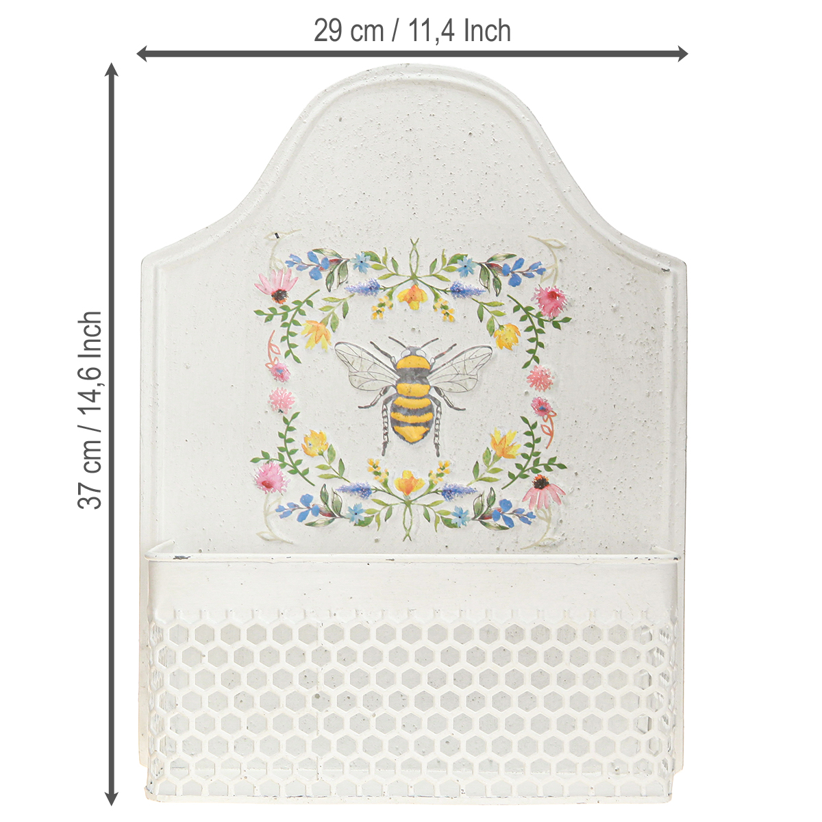 Verleihen Sie Ihrem Wohnzimmer oder dem Balkon einen charmanten Vintage-Look mit unserem cremefarbenen Blumenkasten zum Hängen aus Metall. Dieses einzigartige Dekorationsstück vereint Funktionalität mit ästhetischem Design. Besonders die kunstvolle Prägung einer Biene, umrahmt von farbenfrohen Blumen, macht den Blumenkasten zu einem Blickfang. Die Frontseite des Kastens besticht durch eine Netzoptik, während die Rückseite das etwa 15x15 cm große Bild präsentiert. Perfekt ist die Wanddeko für alle, die eine sommerliche Atmosphäre mit einem Hauch von Nostalgie schaffen möchten.