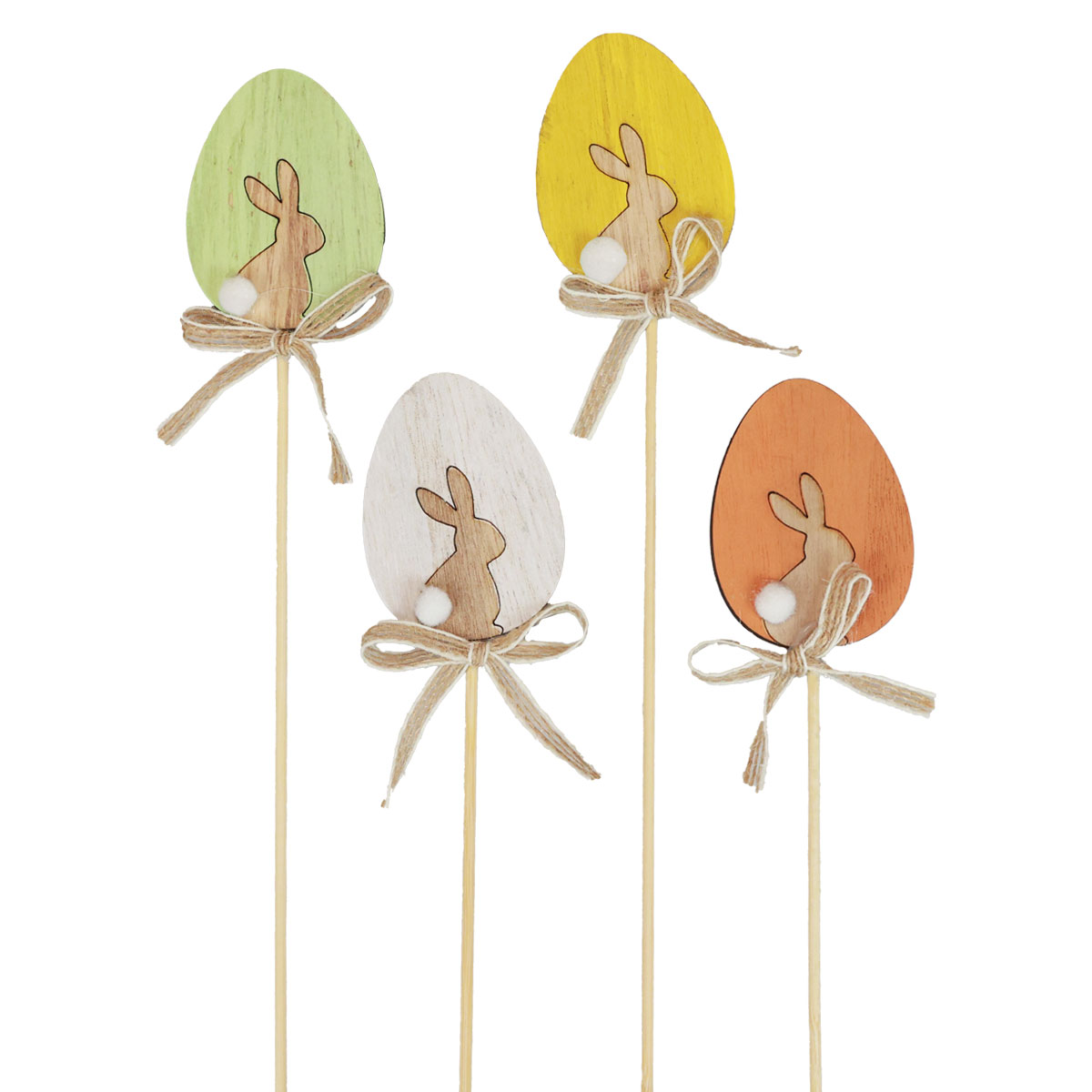 Dekorieren Sie Pflanzen, Gestecke, Sträuße und kleine Geschenke mit diesen Hasen-Eiern für Ostern! Für einen Kranz an der Tür oder an der Wand und auch Tischdeko können Sie die Holzstäbe der Ostereier kürzen und die Deko so einfach in Stroh, Steckschaum oder Erde feststecken. Natürlich lassen sich die Eier am Stab für optimalen Halt ankleben.