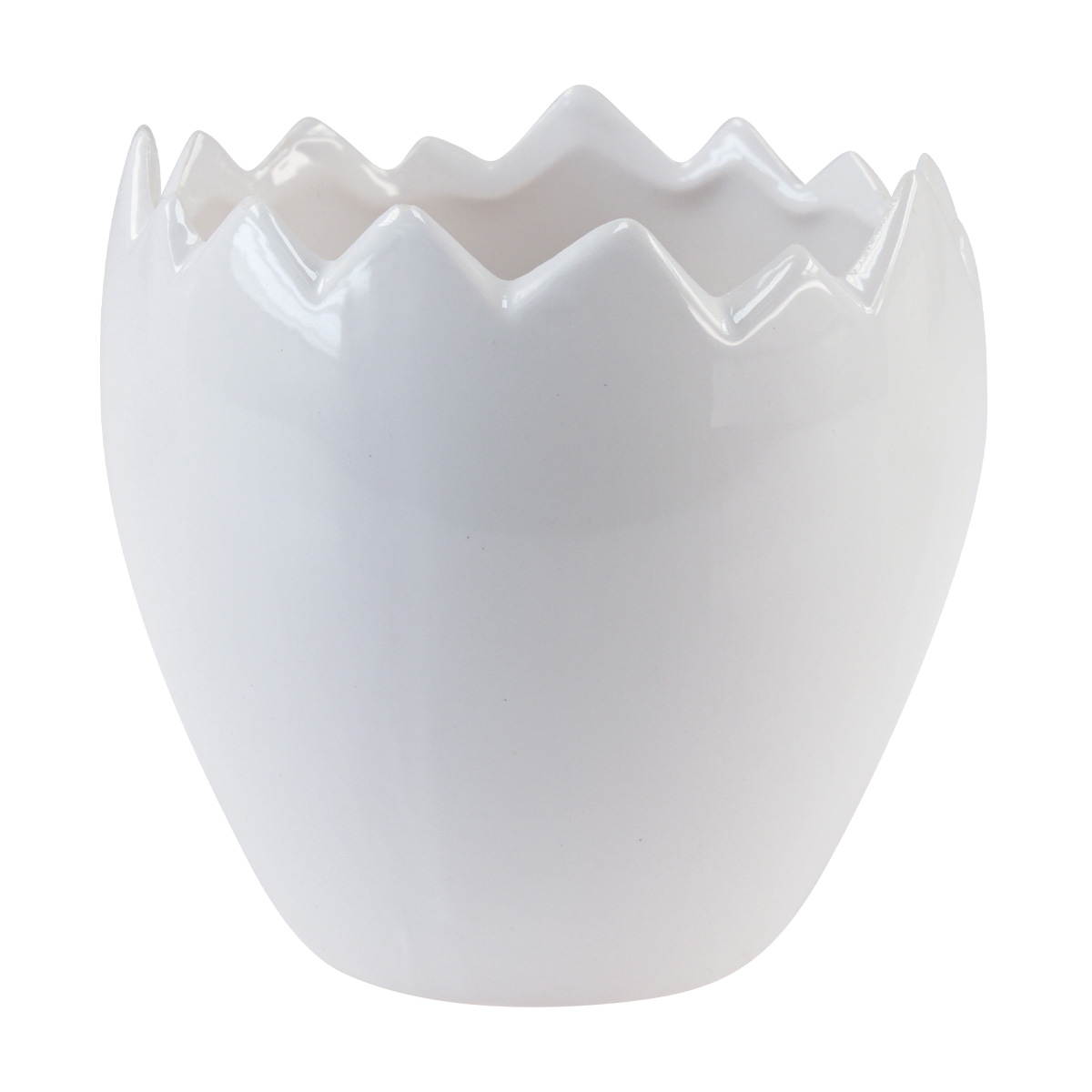 Die schöne, cremeweiße Farbe erinnert tatsächlich an ein frisches Ei und die Krone, die wie eine aufgebrochene Schale aussieht, macht die Osterdeko perfekt. Vielleicht setzen Sie kleine Deko-Küken hinein oder staffieren den Übertopf aus Keramik mit Kunstgras aus, um ein Osternest zu schaffen.
