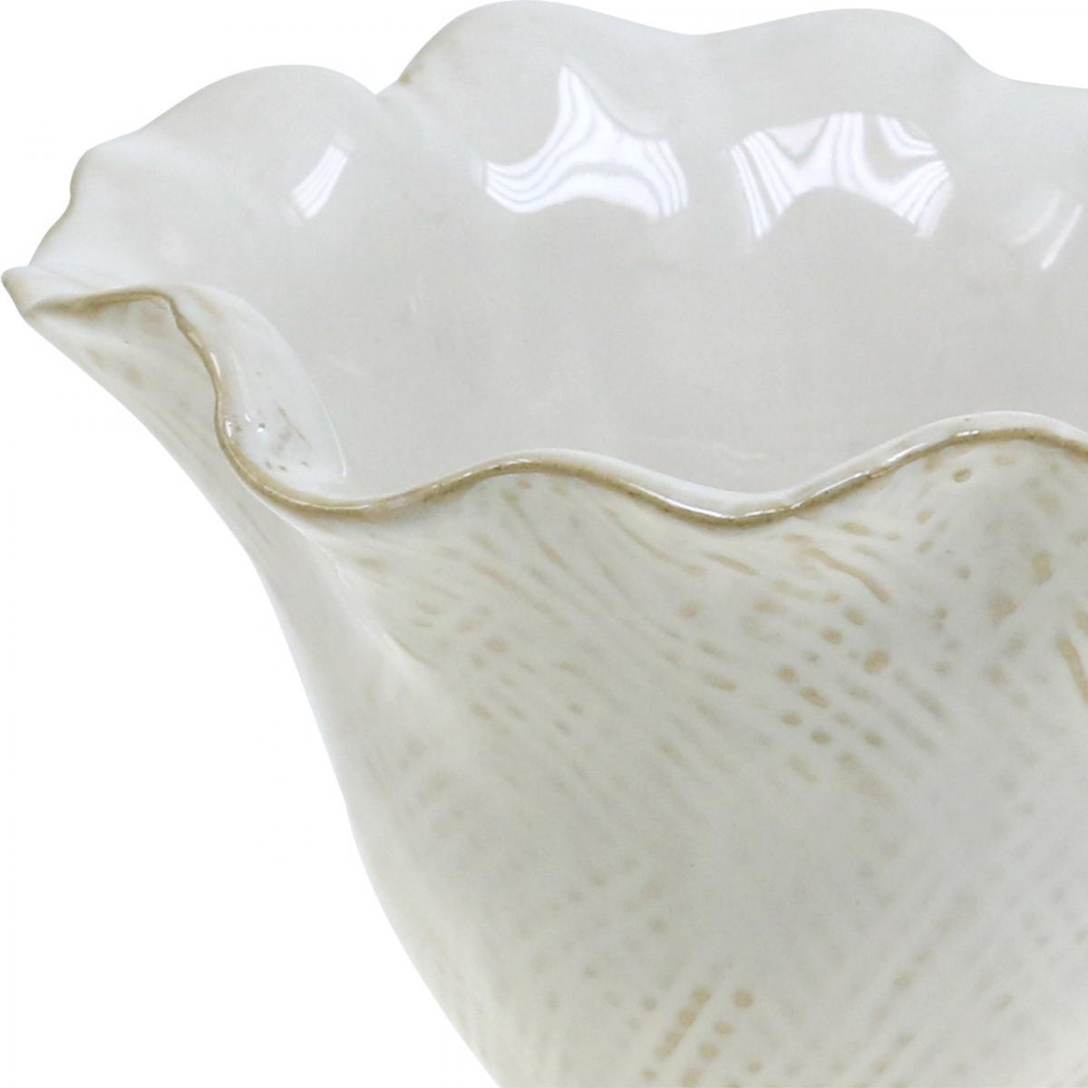 Der Pflanztopf hat die Form einer sich nach oben hin öffnenden Blüte und steht auf einem kleinen runden Fuß. Der Rand der geschwungenen Blütenform ist in einem dezenten Beige bemalt. Die Außenwand des Blumentopfs ist mit weißen Schraffuren und beigen Akzenten verziert. Dank der kleinen Schaumstoffnoppen am Boden kann die Keramikvase auch auf empfindliche Möbel-Oberflächen wie Glas oder Holz gestellt werden, ohne Kratzer und Spuren zu hinterlassen.