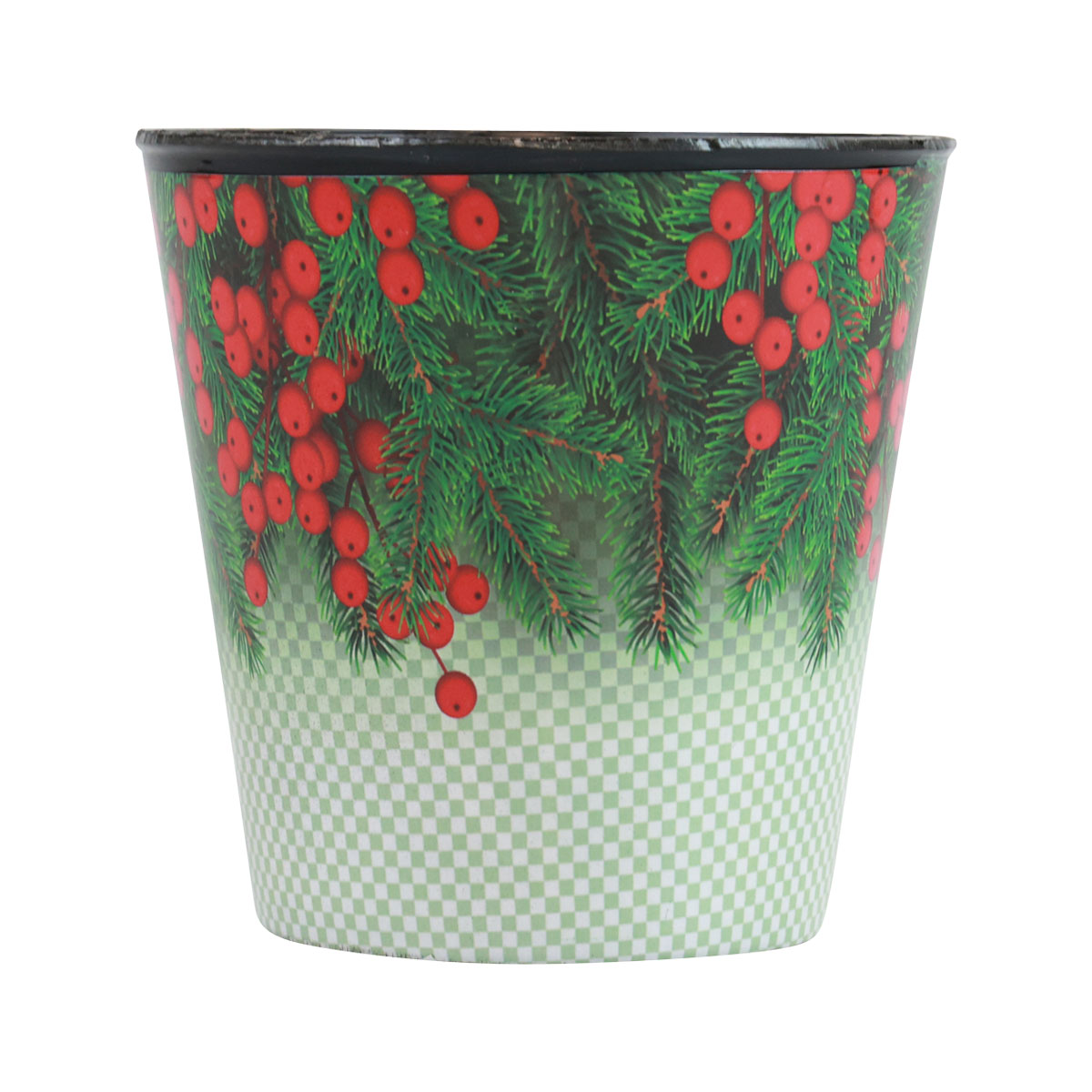 Der Blumentopf, aus robustem Kunststoff gefertigt, bietet eine Fülle von kreativen Gestaltungsmöglichkeiten, um weihnachtliche Gestecke in Rot und Grün zu kreieren. Er ist mit dem Motiv eines grünen Ilex-Zweigs, übersät mit roten Beeren, verziert. Nach unten hin geht die bedruckte Folie in ein charmantes grün-weißes Schachbrettmuster über. Die Innenseite des Übertopfs hingegen ist in Schwarz gehalten.
