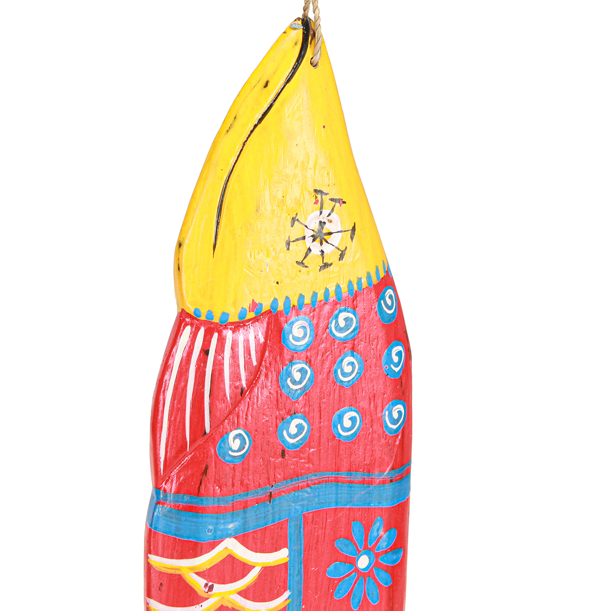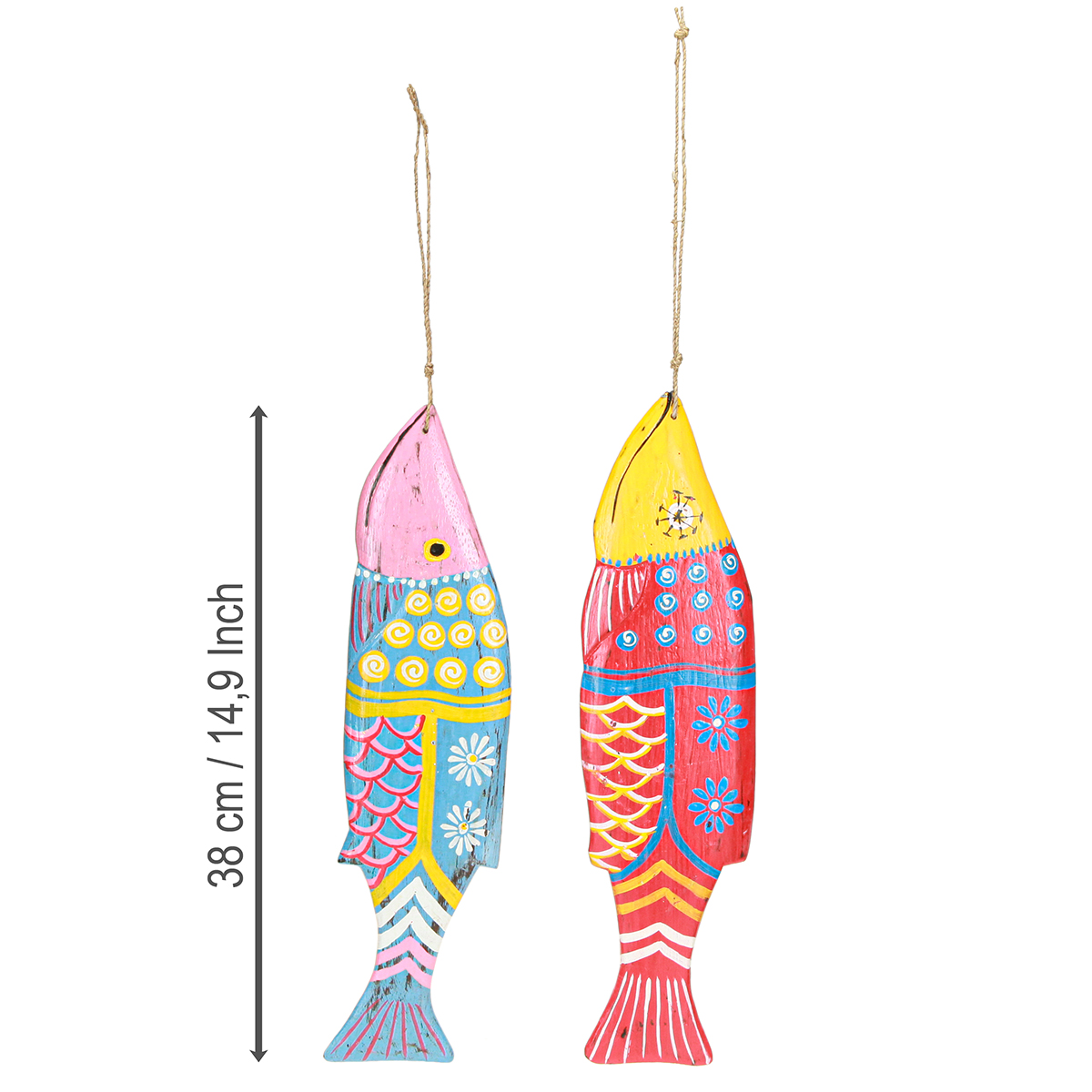 Unsere „Bunten Holzfische zum Hängen“ bringen eine frische Meeresbrise in Ihr Zuhause und sind die perfekte Ergänzung für all jene, die ein Strandhaus-Flair in ihre Räume zaubern möchten. Egal, ob im Wohnzimmer, auf der Terrasse oder im Badezimmer – diese handbemalten Deko-Holzfische verleihen jedem Raum einen maritimen Touch. Die Dekofische aus extrem leichtem Albizia-Holz zeichnen sich durch ihre detailgetreue Bemalung mit traditionellen Mustern aus. Jedes Set besteht aus zwei einzigartigen Fischen, die in harmonisch abgestimmten Farbtönen gehalten sind: ein blau-gelber und ein hellblau-rosaroter Fisch mit bunten Mustern, Augen, Flossen und Schuppen. Die aus Seegras geflochtenen Kordeln im Maul des Fischs ermöglichen eine einfache und stilvolle Anbringung, , um das Meeresfeeling perfekt zu machen – sei es an Wänden, Regalen oder im Badezimmer. Lassen Sie sich inspirieren und integrieren Sie diese einzigartigen Dekostücke in Ihr Wohnkonzept - für eine entspannte Atmosphäre voller Charme.