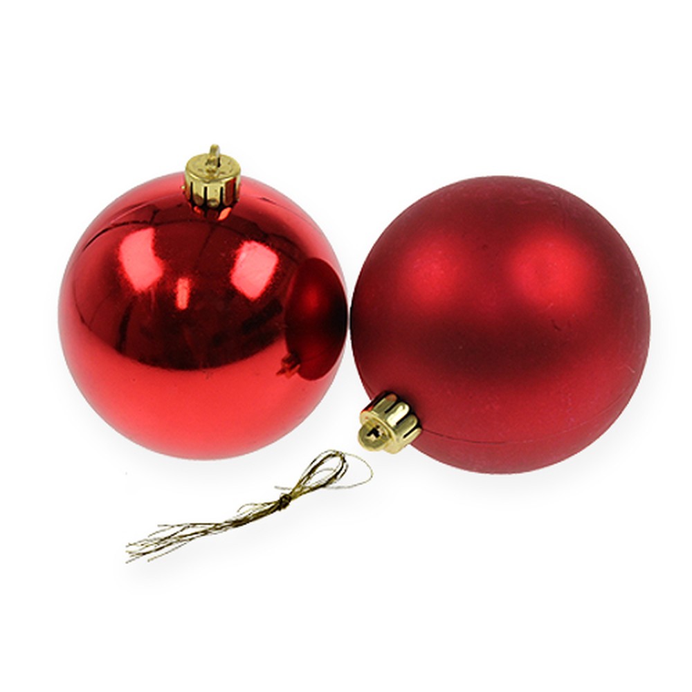 Die Christbaumkugeln aus Plastik in Rot befinden sich in einem 6er-Set und sind alle mit der Öse circa 9 Zentimeter groß. Die Kugeln selbst haben dabei einen Durchmesser von circa 8 Zentimetern.