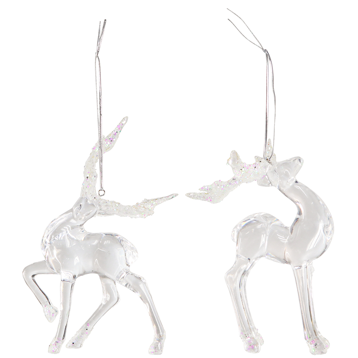 Die Weihnachtsdeko zum Hängen, zwei prachtvolle Hirsche ist ideal für die moderne sowie klassische Festdekoration. Ob ohne die Kordel als weihnachtliche Tischdekoration oder als funkelnde Fensterdekoration – diese Acryl-Hirsche sind echte Allrounder. Die glasklaren Figuren sind detailliert gearbeitet und das Geweih zusätzlich mit buntem Glitter besetzt, was Ihrer Weihnachtsdekoration eine besonders exklusive Note verleiht.