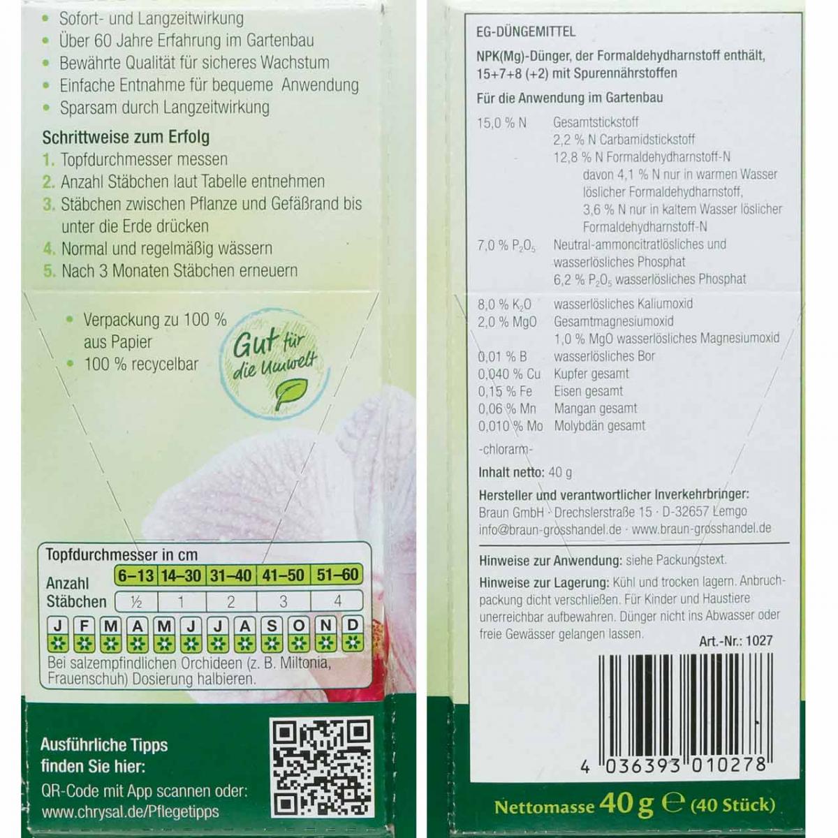 Die Düngestäbchen enthalten sorgfältig ausgewählte Nährstoffe in einer idealen Zusammensetzung speziell auf Orchideen und insbesondere Phalaenopsis abgestimmt. Der Mineraldünger ist durch seine Langzeitwirkung von bis zu 3 Monaten ausgesprochen sparsam!