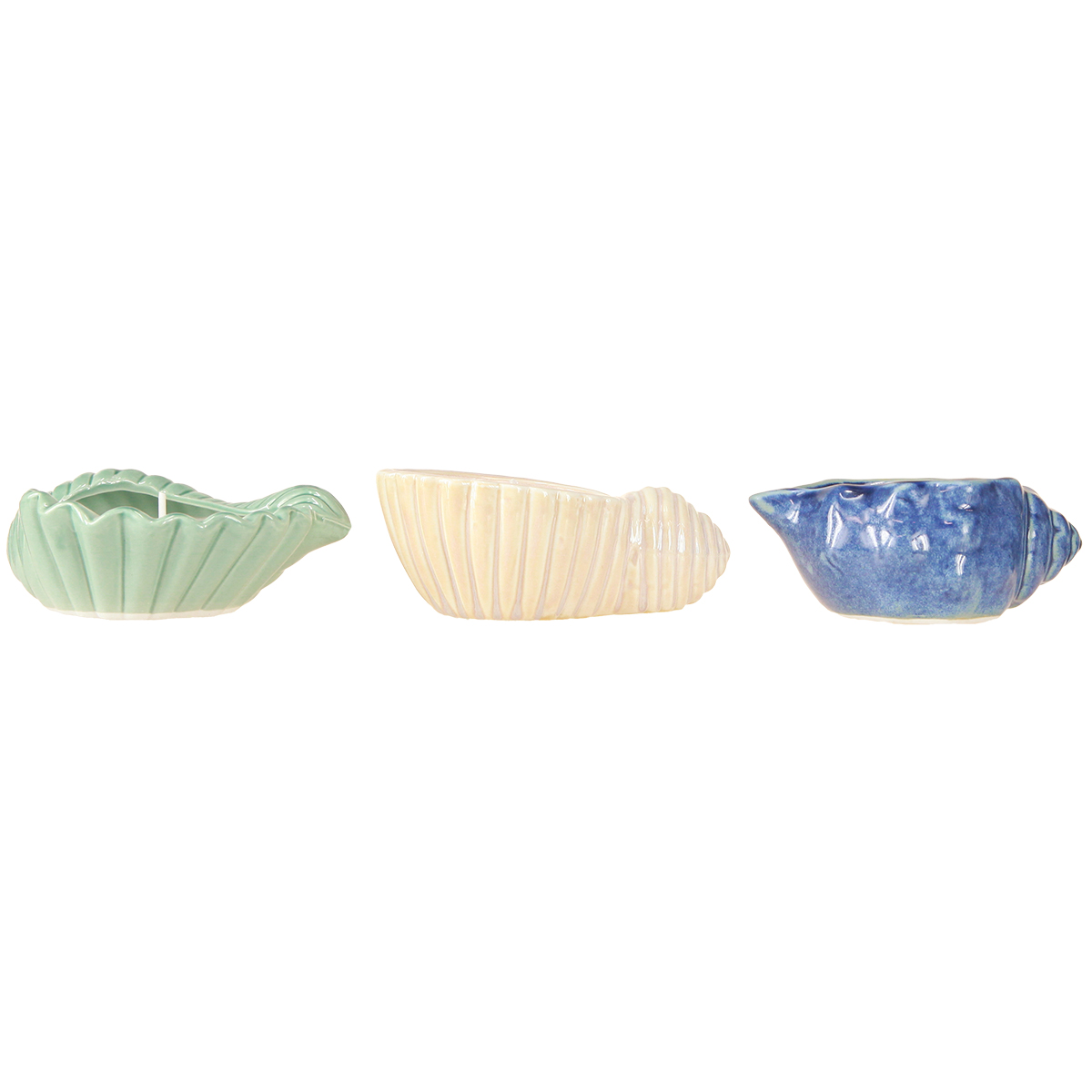 - Drei einzigartige Muschelformen in maritimen Farben: Weiß, Grün und Blau.