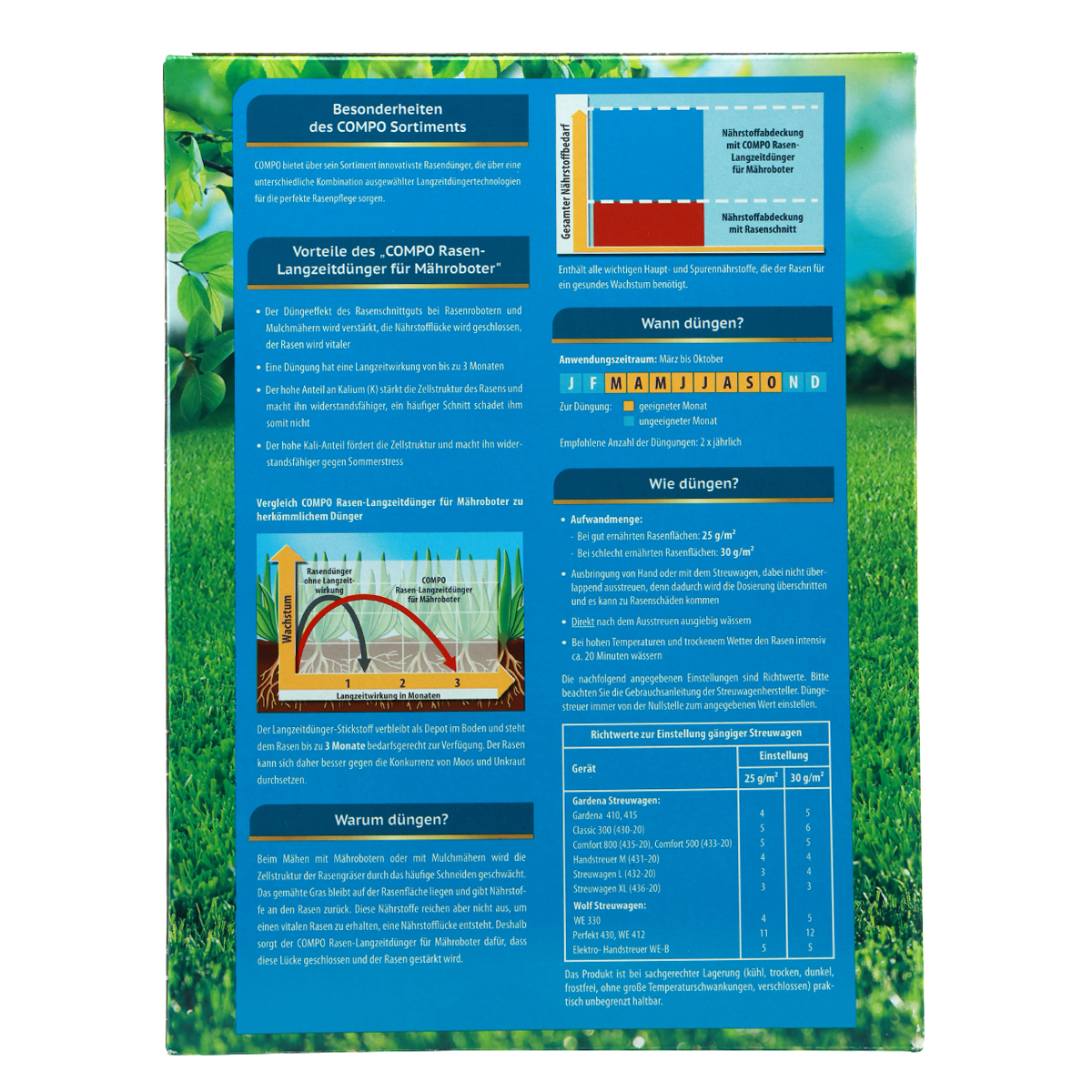Der 5-Kilo-Karton Compo Rasen Langzeit-Dünger für Mähroboter ist ausreichend für bis zu 200m². Sie können den Rasendünger zwischen März und Oktober insgesamt zweimal jährlich ausbringen. Ihr Rasen ist als mit dem Düngemittel von Compo über die gesamte Vegetationsperiode optimal versorgt.