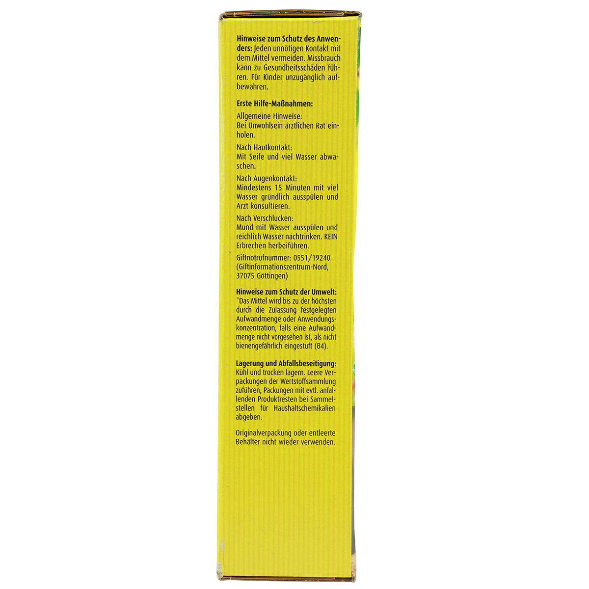 Sicherheitshinweise: Jeden unnötigen Kontakt mit dem Mittel vermeiden. Missbrauch kann zu Gesundheitsschäden führen. Ist ärztlicher Rat erforderlich, Verpackung oder Kennzeichnungsetikett bereithalten. Darf nicht in die Hände von Kindern gelangen. Beim Umgang mit dem Produkt nicht essen, trinken oder rauchen. Langärmeliges Hemd, lange Hose tragen bei der Ausbringung von Pflanzenschutzmitteln.