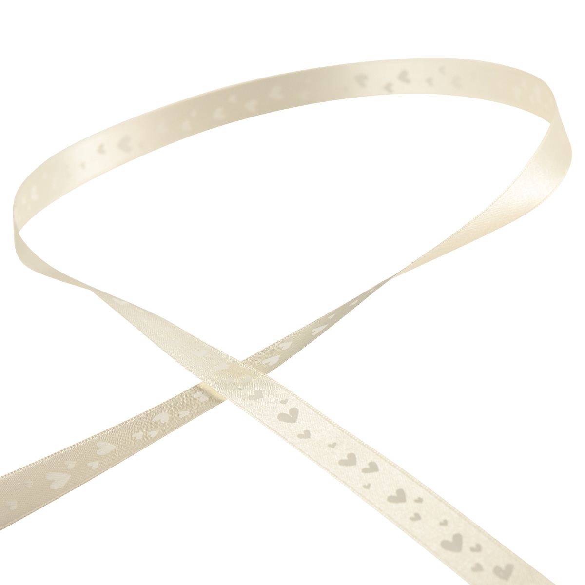 Das schmale Geschenkband hat einen seidigen Glanz und ist mit weißen Herzen bedruckt, die sich zart vom cremefarbenen Stoff abheben. Die hohe Qualität des romantischen Dekobands zeigt sich auch in den Webkanten, die ein Ausfransen unmöglich machen und das Band stilvoll abschließen.