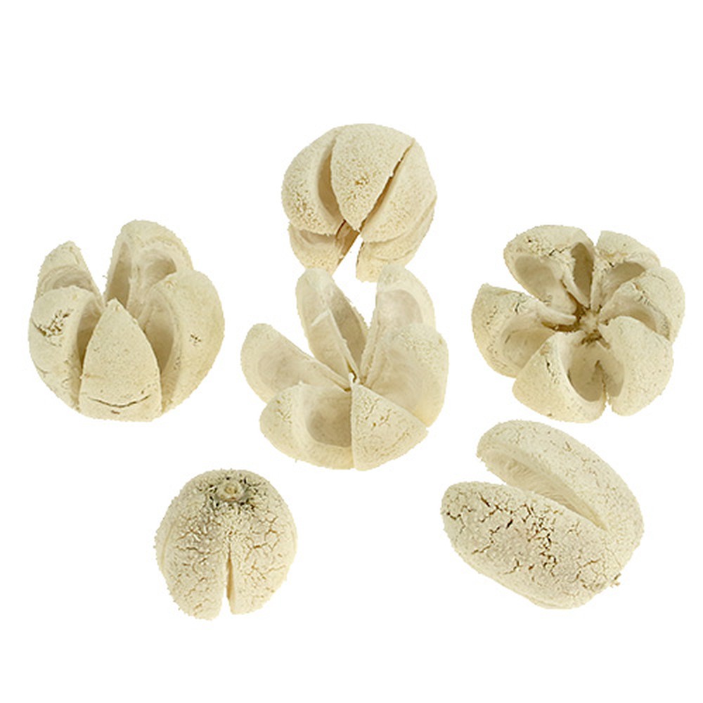 Wenn Sie nach einer originellen Naturdeko suchen, dann sind Sie bei der sogenannten und gebleichten Bullet Flower genau richtig! Das Naturmaterial, das wie eine offene Blüte aussieht, ist eigentlich die Frucht des Breiapfelbaumes, der auch Manilkara zapota genannt wird. Die Frucht, die auch einer kleinen Limone ähnelt, wurde sorgsam aufgeschnitten, sodass 4 bis 6 einzelne Fächer entstehen, entkernt, bis zur Verholzung getrocknet und anschließend gebleicht.