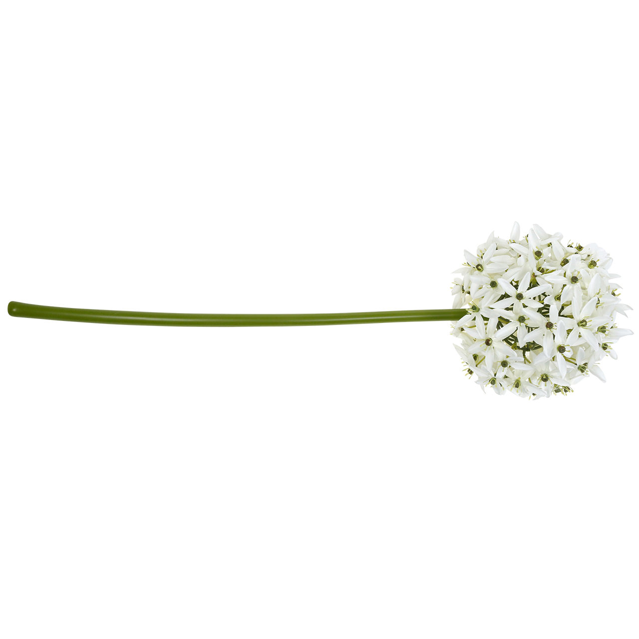 Die künstliche Lauchblüte in Weiß besitzt mit ihrem langen Stiel eine Gesamtlänge von ungefähr 72 Zentimetern. Die kugelförmige Blütendolde hat dabei einen Durchmesser von etwa 20 Zentimetern.