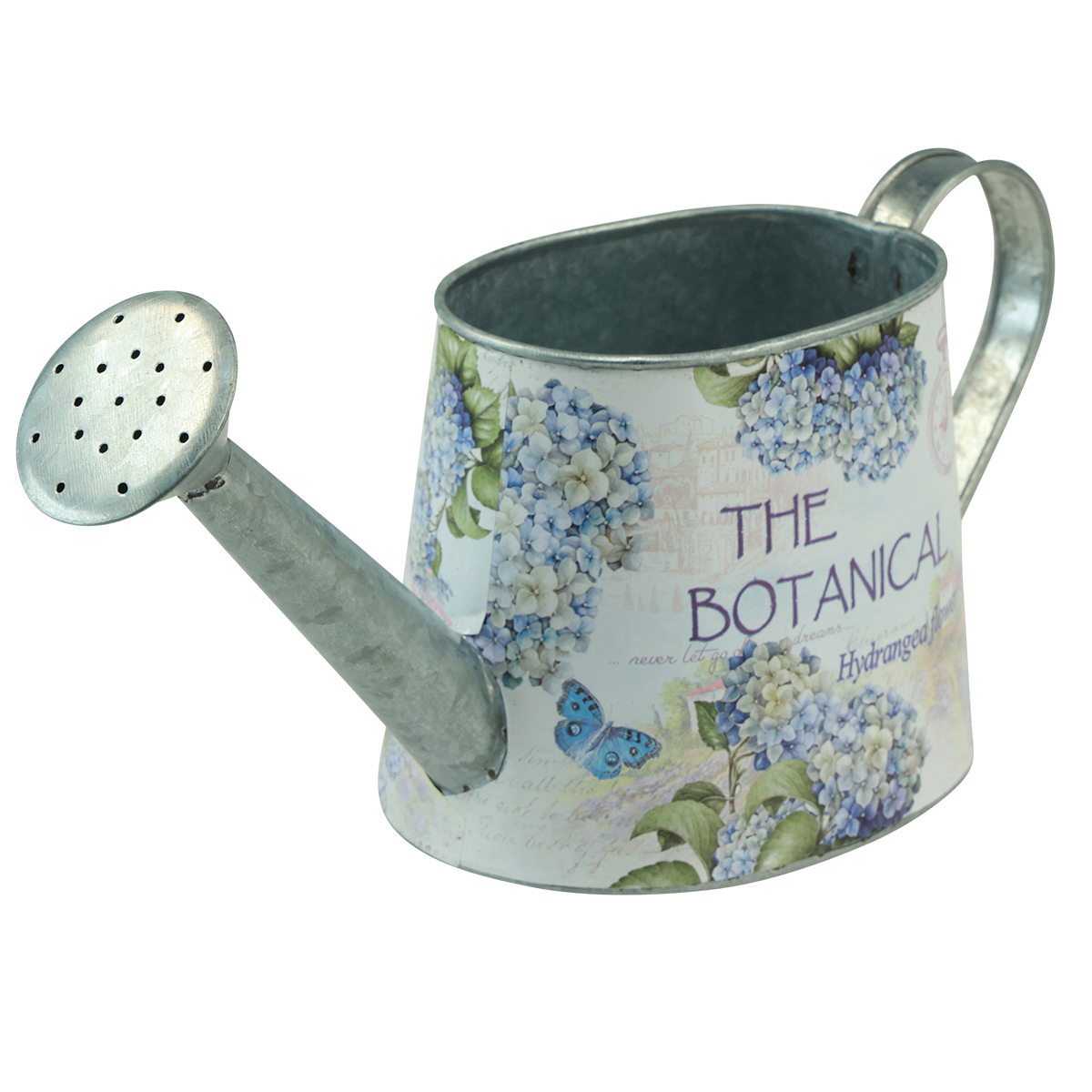 Die verzinkte Kanne glänzt an und für sich ganz in der Farbe Silber. Auf der Außenseite ist jedoch der schöne Hortensien-Print angebracht. Tülle und Henkel bleiben silbern, so dass Sie ein zweifarbiges Accessoire erhalten.