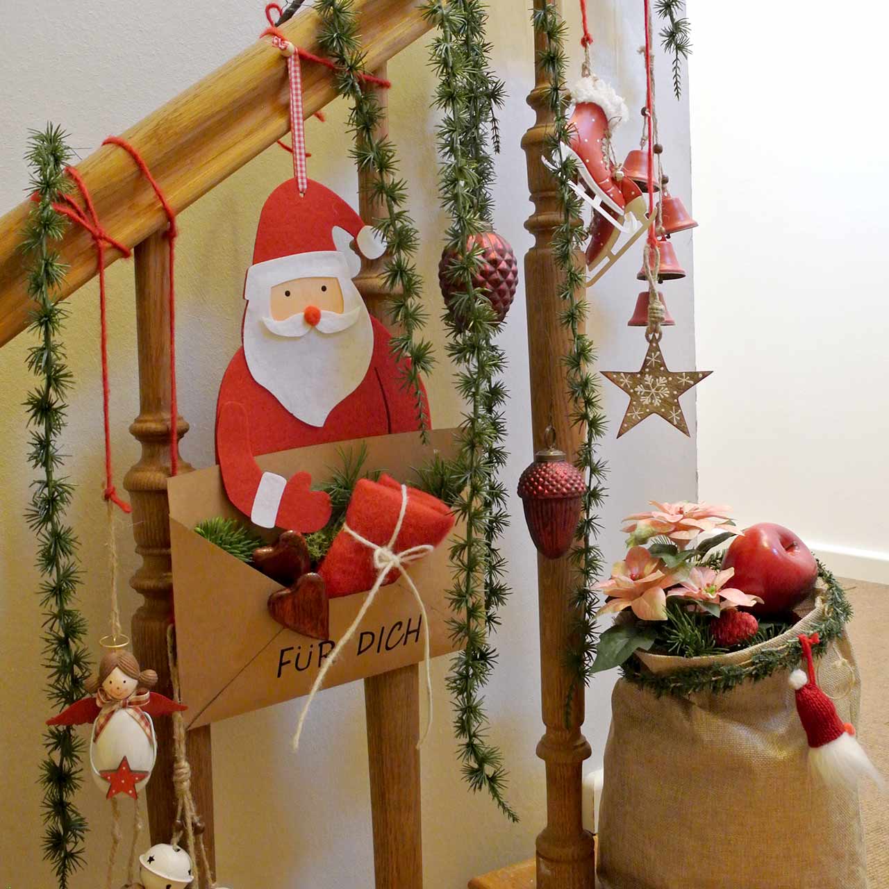 Sie erhalten den Deko-Hänger Weihnachtsmann mit Briefumschlag im Set zu 4 Stück. Ein Deko-Hänger „Für Dich“ aus Filz besitzt mit Aufhängeband eine Gesamtlänge von etwa 46,5 Zentimetern. Die Größe des Dekohängers beträgt etwa 37 × 25 Zentimeter. Der flache Briefumschlag hat eine ungefähre Größe von 25 × 18 Zentimeter.