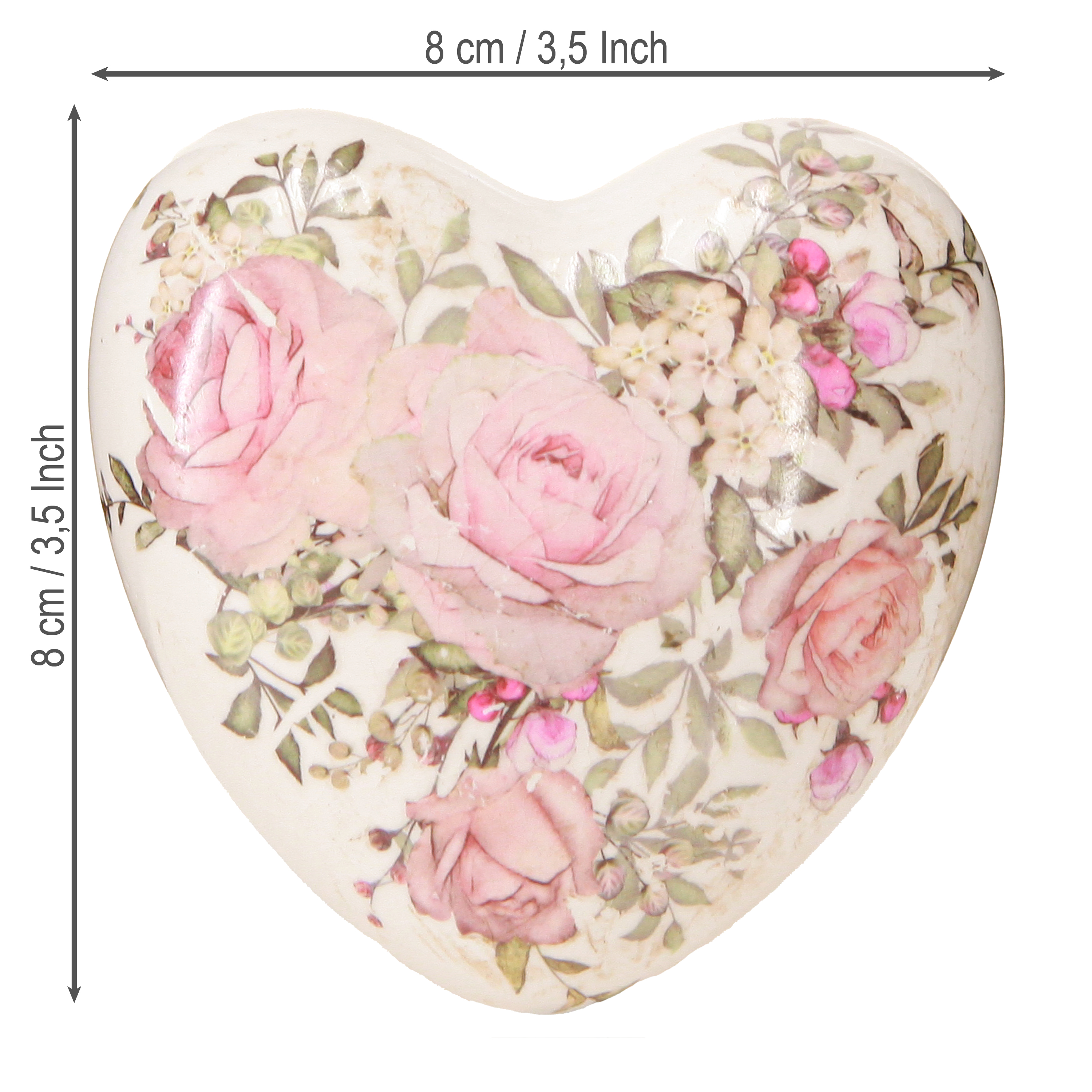 Erleben Sie die zauberhafte Schönheit unserer drei Dekoherzen, die mit einem romantischen Rosenmotiv in sanftem Creme und Rosa gestaltet sind. Die Keramikdekoherzen wirken dank des Krakelee-Effekts besonders charmant und fügen sich wunderbar in einen Vintage- oder Landhausstil ein. Jedes Herz hat die Maße von etwa 8x8 cm und ist mit einem klaren Glanz überzogen, der die zarten Rosendetails hervorhebt. Die Unterseite ist mit drei Schonern ausgestattet, um Ihre Möbel vor Kratzern zu schützen. Diese Dekoherzen sind nicht nur für Ihr Zuhause eine zauberhafte Ergänzung, sondern auch ein wunderbares Geschenk für Verliebte oder zur Hochzeit. Platzieren Sie die Keramikherzen auf Ihrem Tisch als frühlingshafte Tischdekoration oder nutzen Sie sie als Highlight in Ihrem Wohnzimmer. Ob im Frühling oder Sommer, diese glasierte Herzdeko setzt immer romantische Akzente in Ihrer Wohnung.