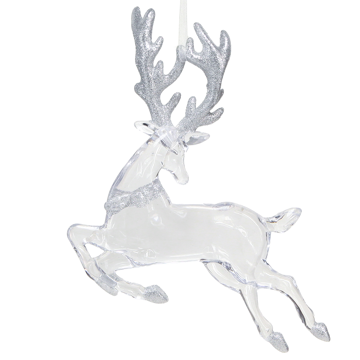 Diese exklusive transparente Hirsch-Deko mit Silber ist ein echter Blickfang für Ihren festlich geschmückten Weihnachtsbaum und darüber hinaus. Der detailreiche Dekohänger wurde liebevoll gestaltet und durch den silbernen Glitter veredelt. Ob als Weihnachtsschmuck am Baum oder Winterdeko zum Hängen im Fenster – dieser Deko-Hirsch sorgt für ein luxuriöses Ambiente.