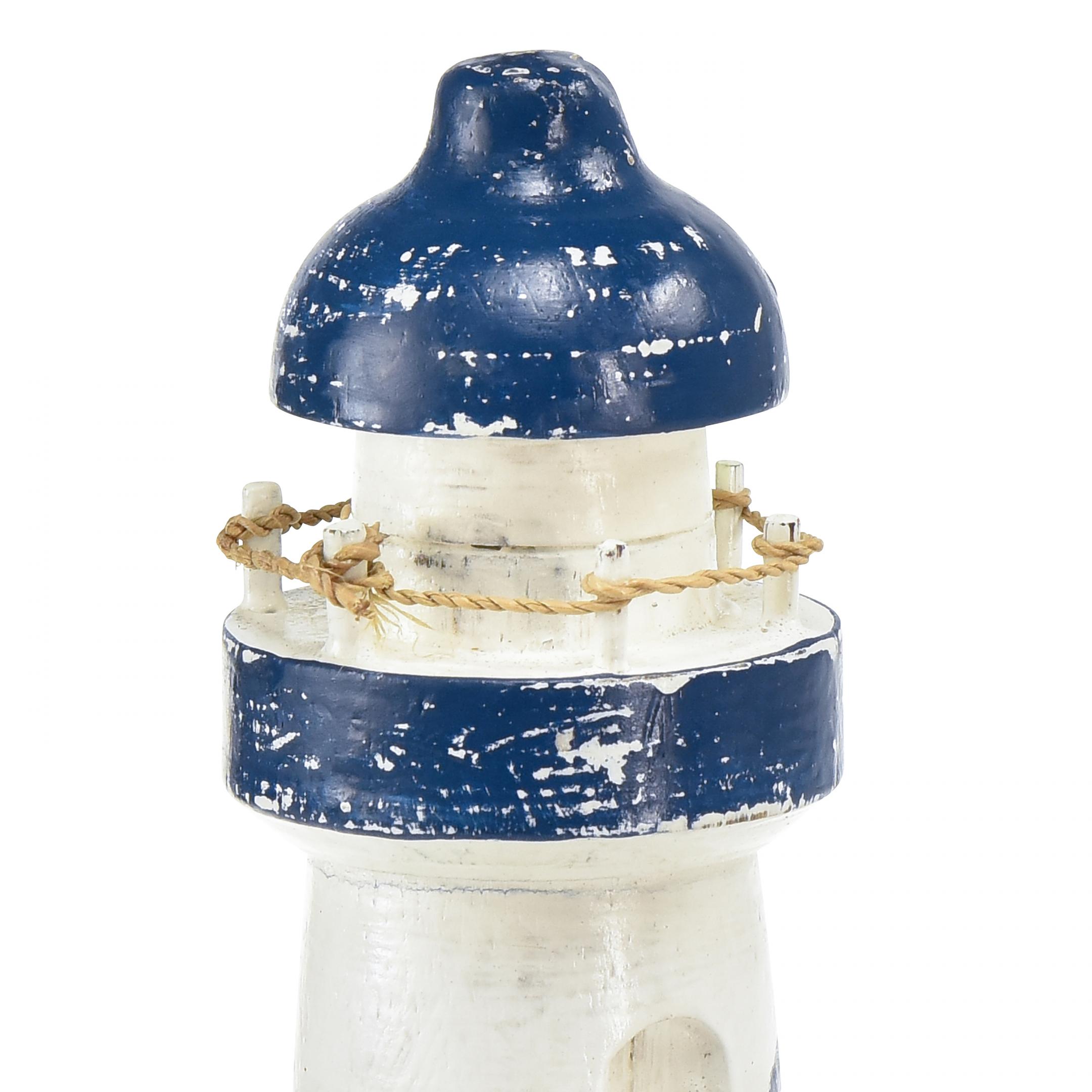 Der Leuchtturm in Blau und Weiß schmückt sich mit einem Geländer aus Naturfasern. Blau sind bei dieser maritimen Tischdeko das Dach über dem Eingang, der Streifen, die Kuppel und die Ränder vom Boden, während der Rest des Leuchtturms in Weiß gehalten ist.Passend für den Vintage-Stil sind die Farben wie gewaschen. Vereinzelt schimmert durch das dunkle Blau das Weiß hervor, wie die helle Farbe des Holzes durch das Weiß hindurch scheint.