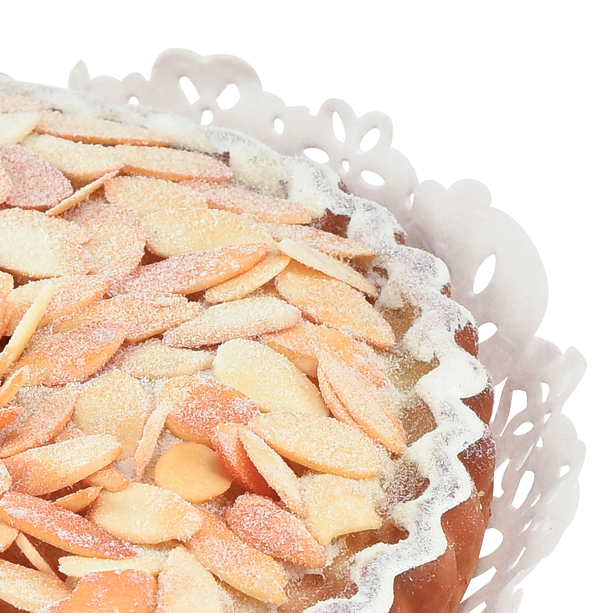 Mit feinem Zucker bestäubt, bedecken die gerösteten Mandelplättchen den goldbraunen Tortenboden. Die Mandeltarte ist von einem Zuckerrand umgeben und ruht auf Tortenspitze wie beim Konditor. Diese Lebensmittelattrappe macht die Illusion also in jeder Hinsicht perfekt.