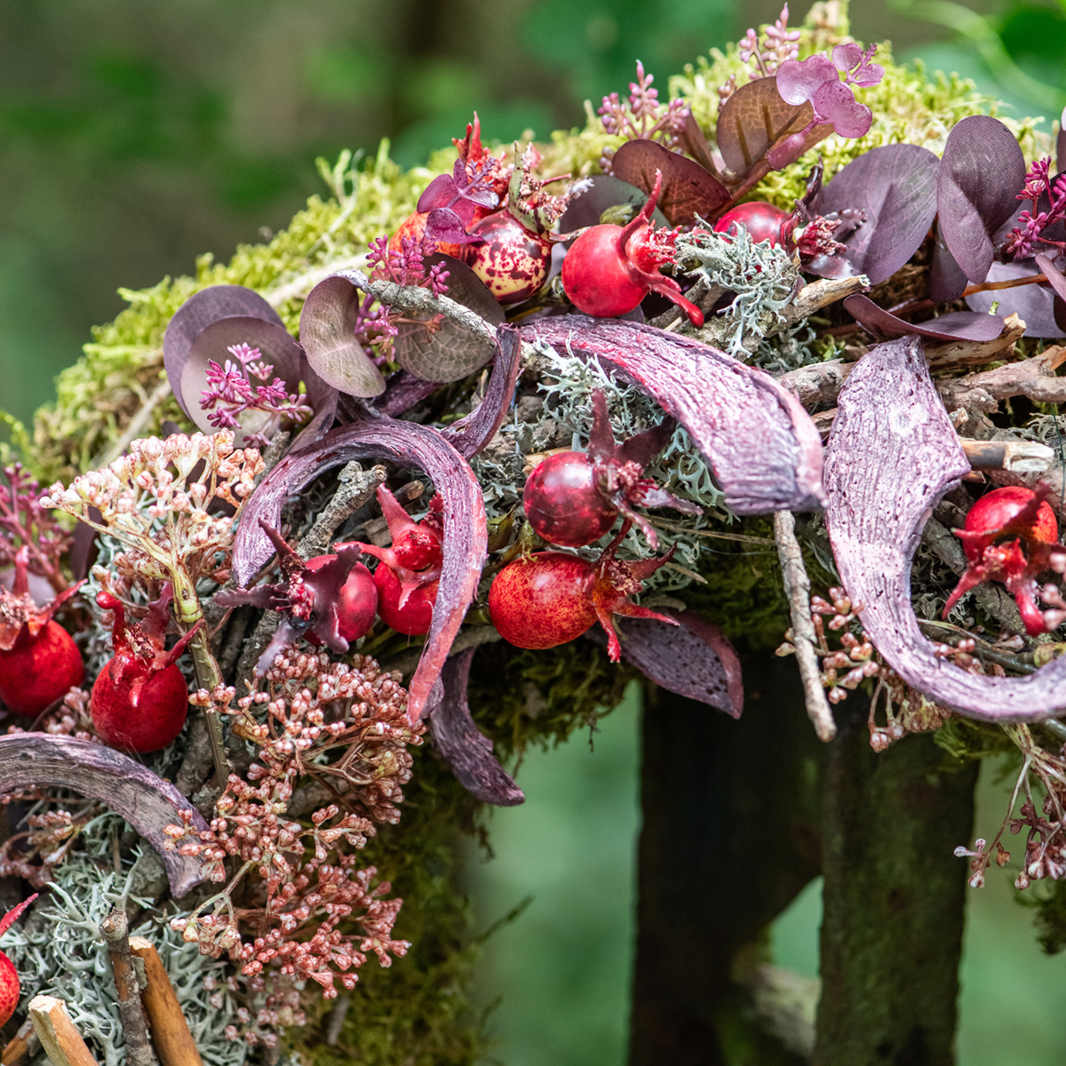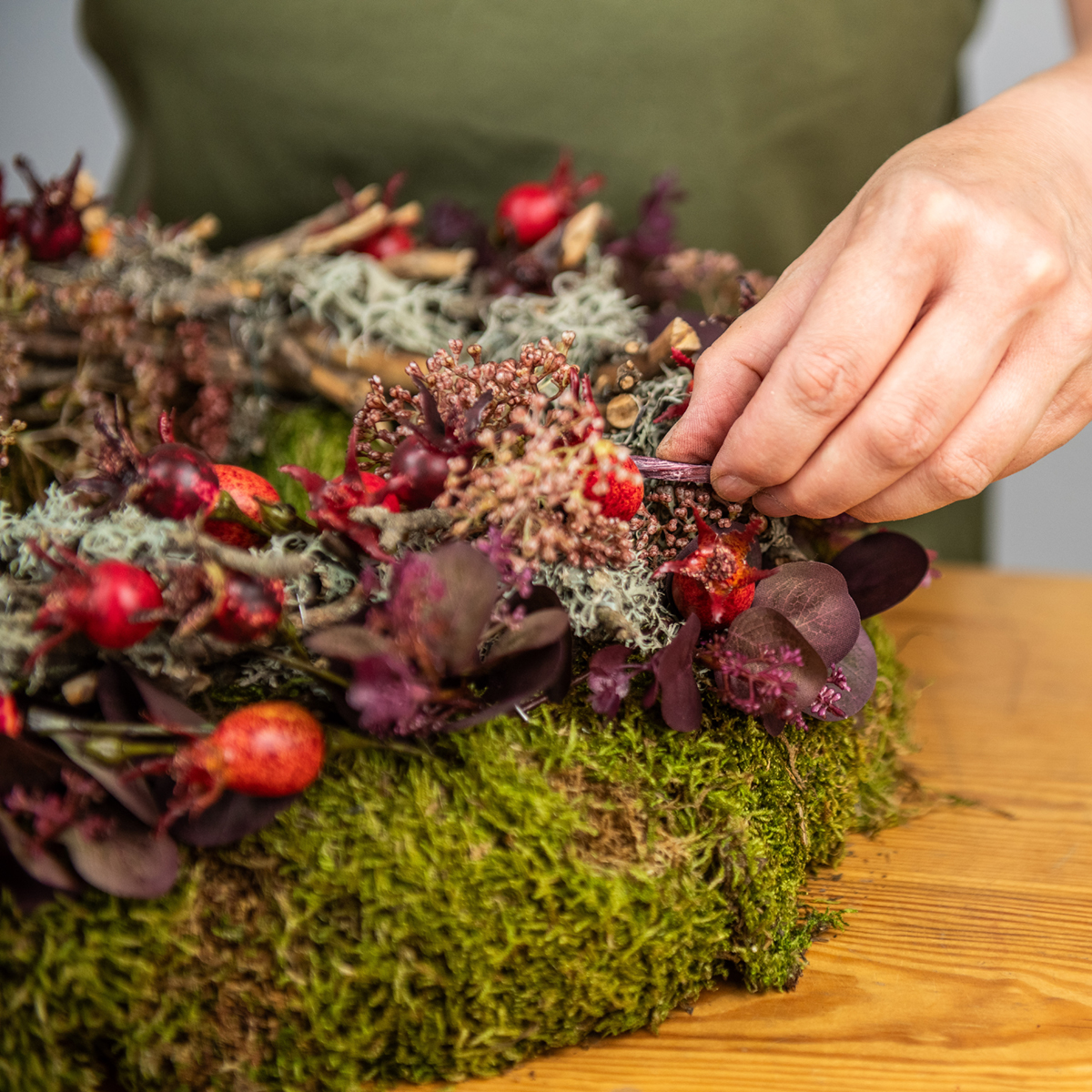 Die hochwertige Naturdeko gibt es übrigens für ein buntes Herbstgesteck in unserem Shop als Natur-Moos auch noch in Dunkelgrün, Rot und Orange.