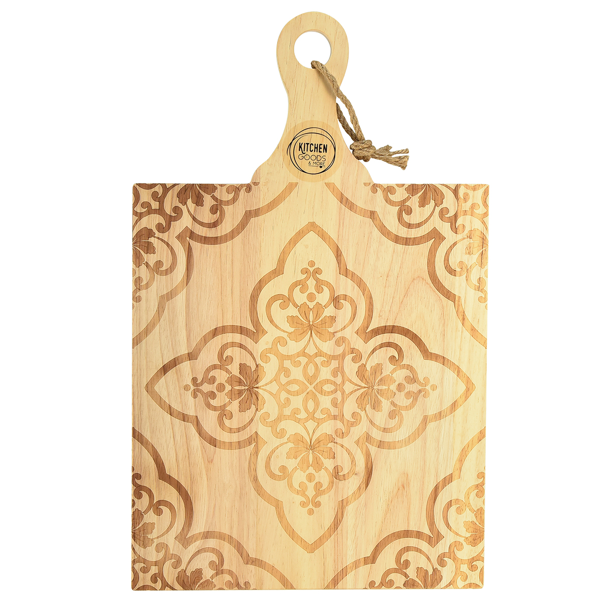 Das florale, ganz klassische Motiv ist dezent in das helle Holz eingebrannt und sieht ansprechend hellbraun aus. Am Griff lässt sich das Holzbrett als Wanddeko aufhängen. Das Schneidebrett ist für Dekorationen und auch kalte Lebensmittel geeignet, da das natürliche Mangoholz nicht nachbehandelt wurde.