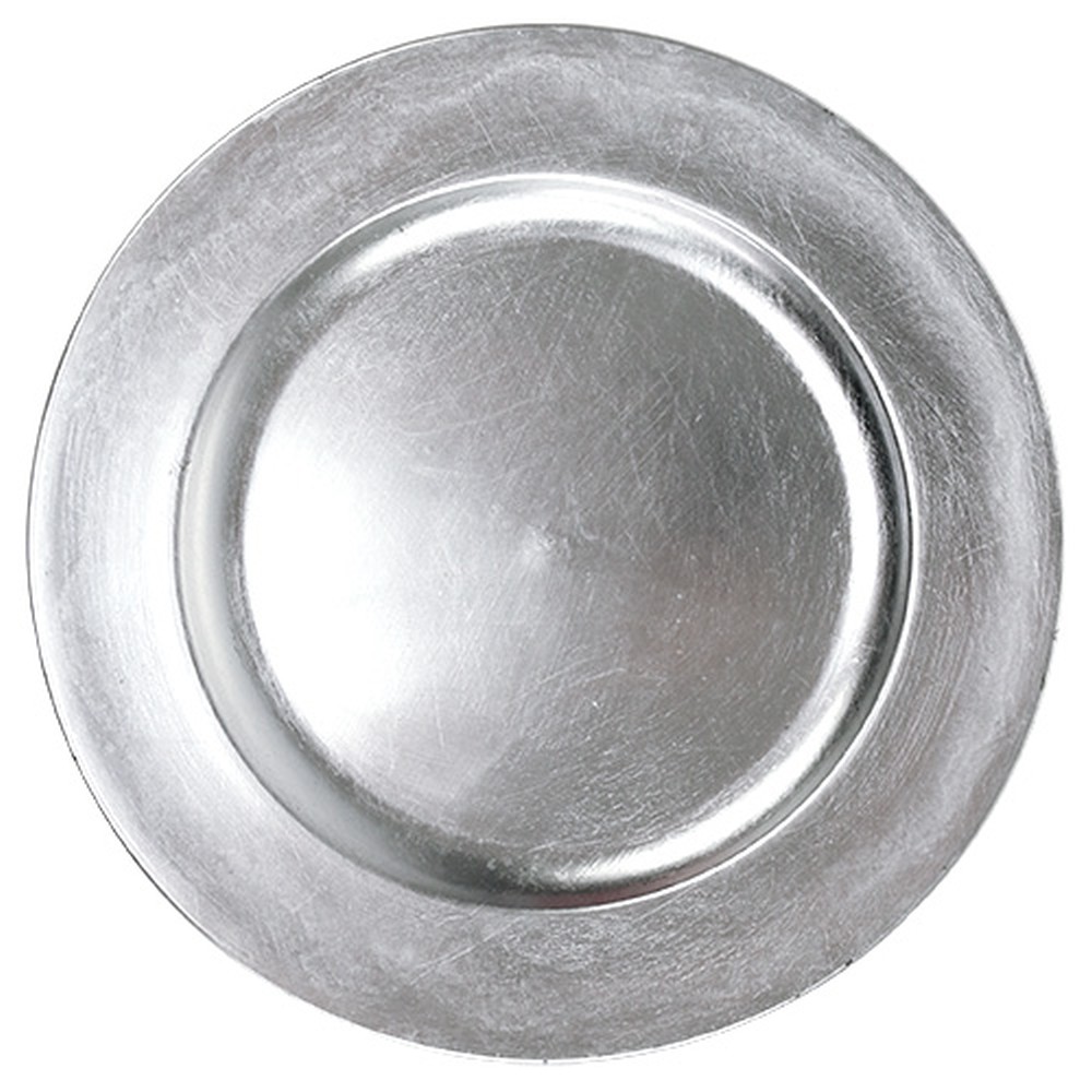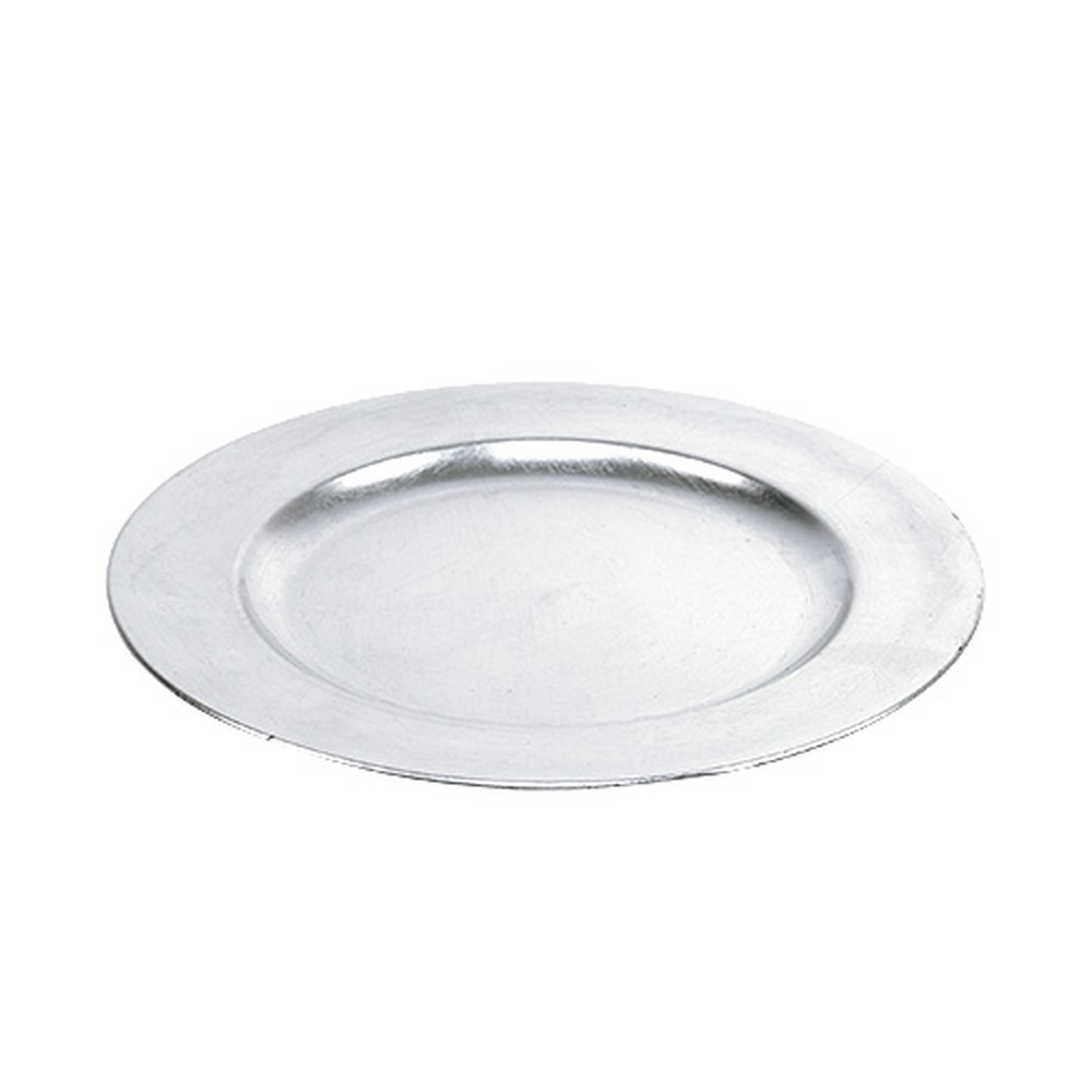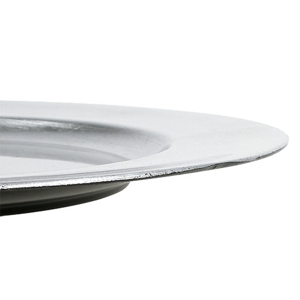 Der Deko-Teller in Silber hat außen einen Durchmesser von circa 28 Zentimetern und auf der Stellfläche einen von etwa 18 Zentimetern.