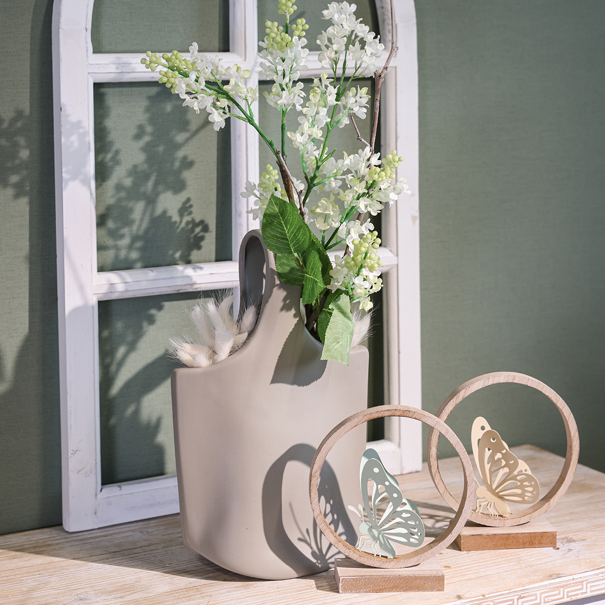 Unsere einzigartige Deko-Vase in Form einer Tasche samt Henkel vereint modernes Design mit der zeitlosen Eleganz von Keramik. In einem ansprechenden rustikalen Grauton gehalten, passt die Vase harmonisch zu verschiedensten Einrichtungsstilen und wird zum Blickfang in jedem Raum. Mit ihren kompakten Maßen von etwa 19×4,5×33 cm eignet sie sich ideal als dekoratives Element auf Fensterbänken, Tischen oder Regalen. Perfekt für das moderne Zuhause, bringt die Vase eine stilvolle Note und sorgt dafür, dass Ihre getrockneten Blumenarrangements stets im besten Licht erscheinen. Die subtile Farbgebung macht die wie ein Shopper gestaltete Vase zum idealen Accessoire für Skandi- oder Industrial-Stil – minimalistisch und ausdrucksstark zugleich.