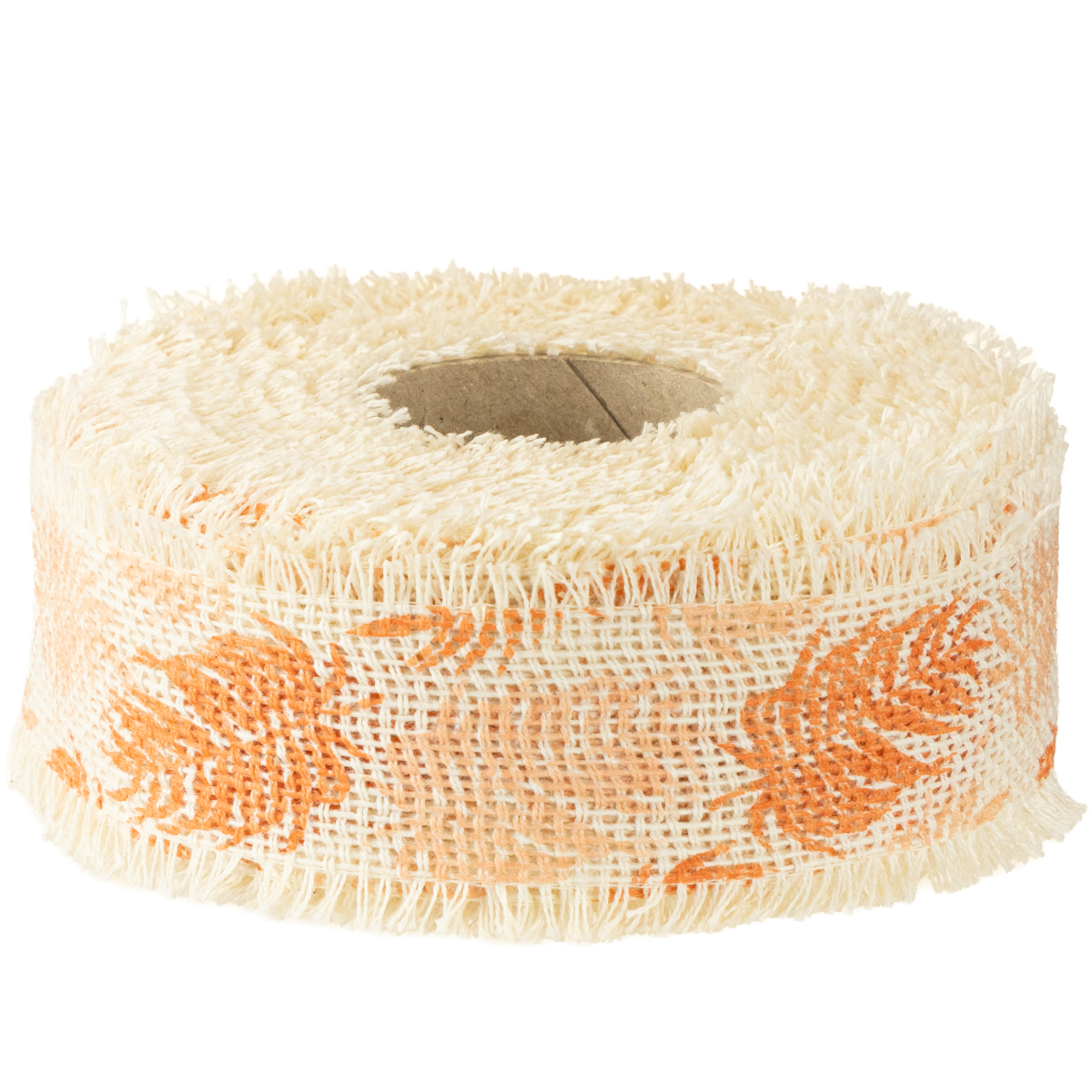 Auf die von Natur aus cremefarbene Baumwolle sind gefiederte Blätter in hellerem und dunklerem Orange gedruckt. Durch die Verwendung des Naturmaterials Baumwolle ist das Band biologisch abbaubar und somit nachhaltiger als vergleichbare Bänder mit Kunststoffanteil. Das Label „Go Green“ bestätigt die Umweltfreundlichkeit des Dekobandes.