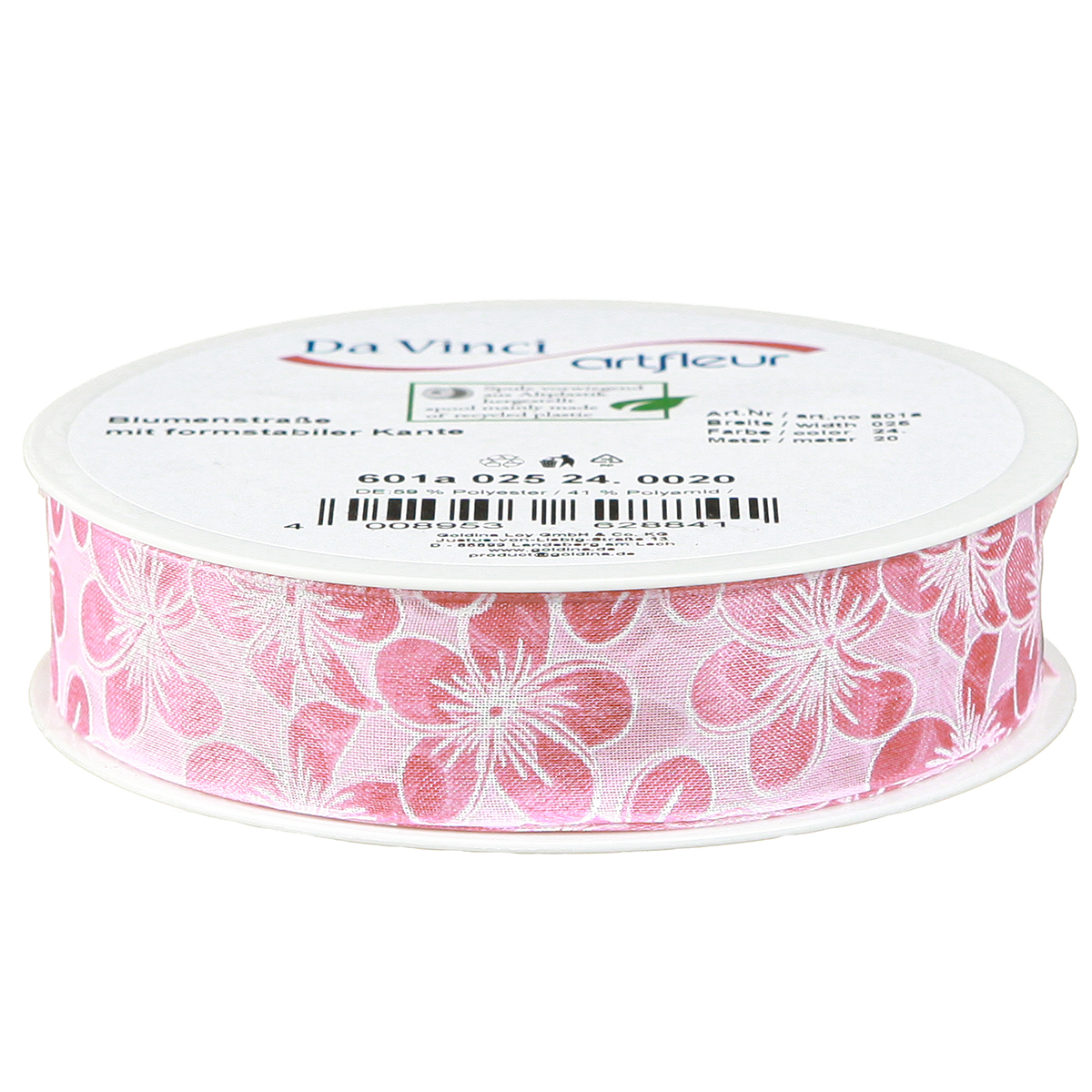 Das Dekoband in Rosa mit Blumen in Rosa und weißen Konturen besteht aus Kunststoff und ist mit seiner Länge von etwa 20 Metern und seiner Breite von ungefähr 25 Millimetern auf eine Spule aus Kunststoff gewickelt.