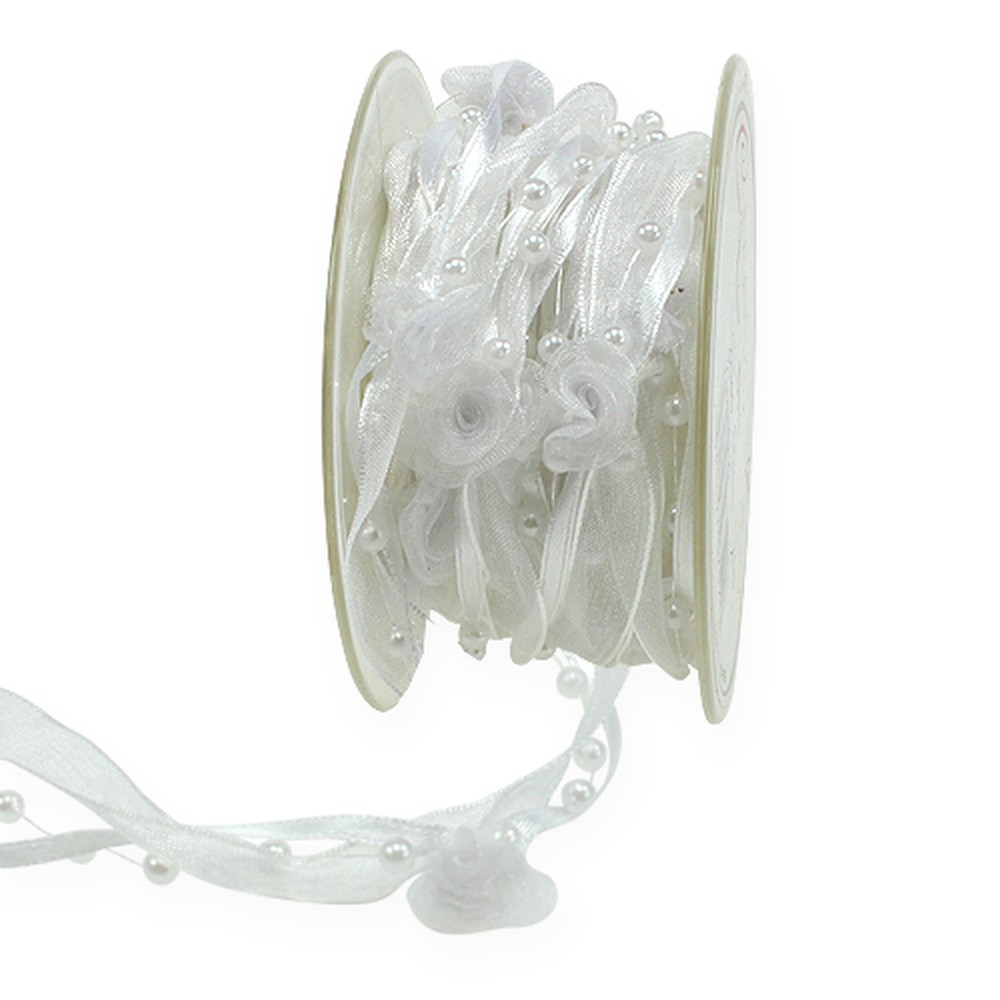 Das weiße Dekoband „Valentino“ aus 100% Polyester wird auf einer Kunststoff-Spule geliefert und ist etwa 15 Millimeter breit und ungefähr 5 Meter lang. Während die Rosen im Durchmesser circa 2 Zentimeter messen, sind es bei den Perlen nur etwa 4 Millimeter.