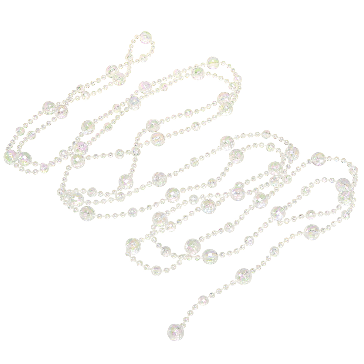 Jede transparente Perlenkette mit weißer Schnur ist ungefähr 2,7 Meter lang. Der Durchmesser der großen Perlen liegt bei ungefähr 1 Zentimeter.