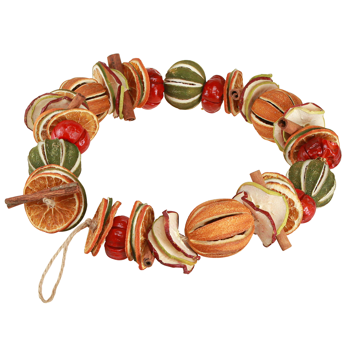 - Rustikale Dekogirlande aus getrockneten Naturmaterialien; Limetten, Orangen, Äpfeln, Zimt und runde Peperoni