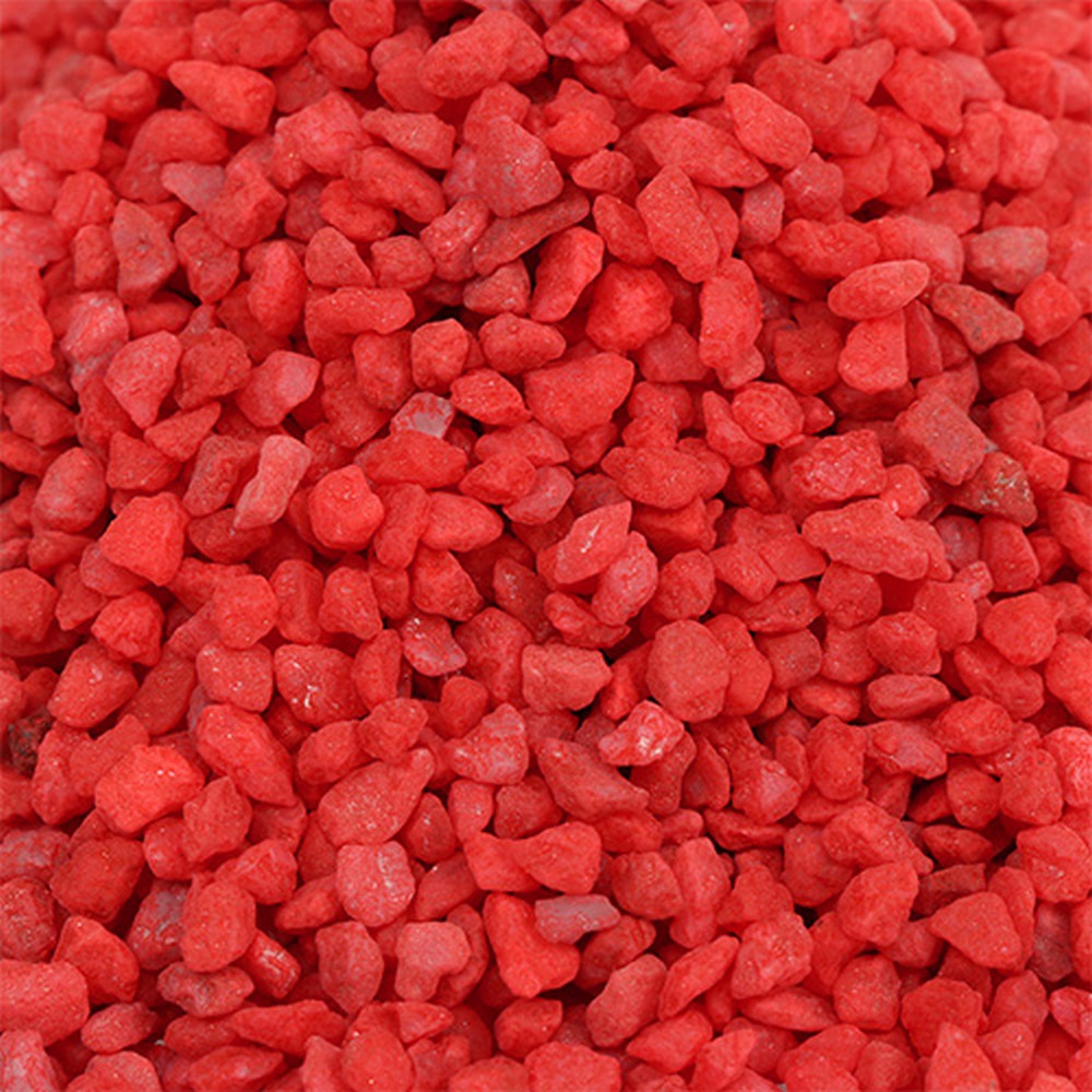 Der Beutel enthält insgesamt 2 Kilogramm rot eingefärbtes Dekogranulat aus Marmor. Die Natursteine sind jeweils in etwa 2 bis 3 Millimeter groß.
