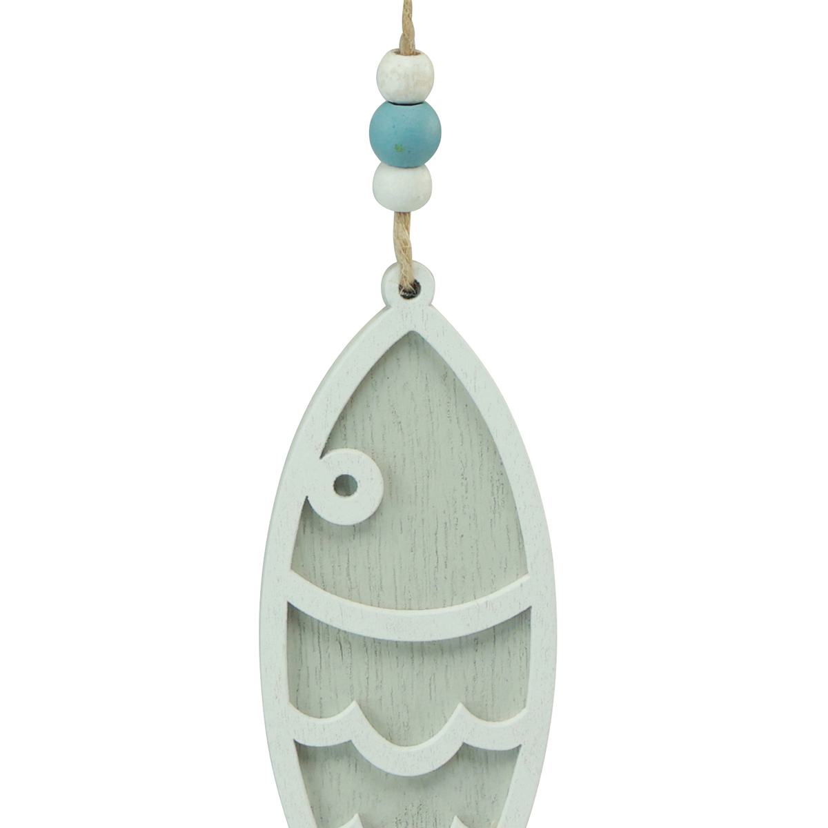 Zum Hängen haben die Deko-Fische einen Aufhänger in Naturfarben, der wiederum mit weißen und blauen Holzperlen geschmückt ist.