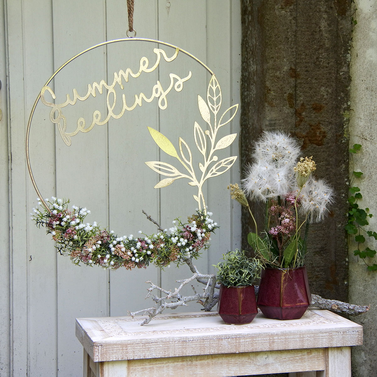 Denn durch die Beschichtung in Rosé-Metallic und Abriebspuren in Türkis ist die Wanddeko ganz an den Farbtrends dieses Sommers ausgerichtet, hat aber zugleich eine zeitlose Schönheit. Dazu trägt der Zweig mit den puristisch gestalteten Blättern bei, der den Metallring abschließt. Die Jutekordel als Aufhänger gibt der Sommerdeko zusätzlich einen rustikalen Touch.