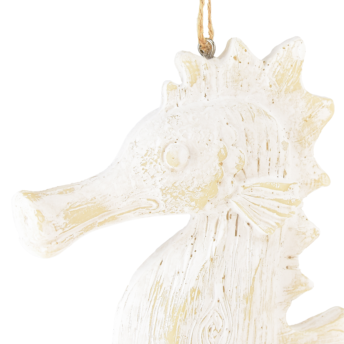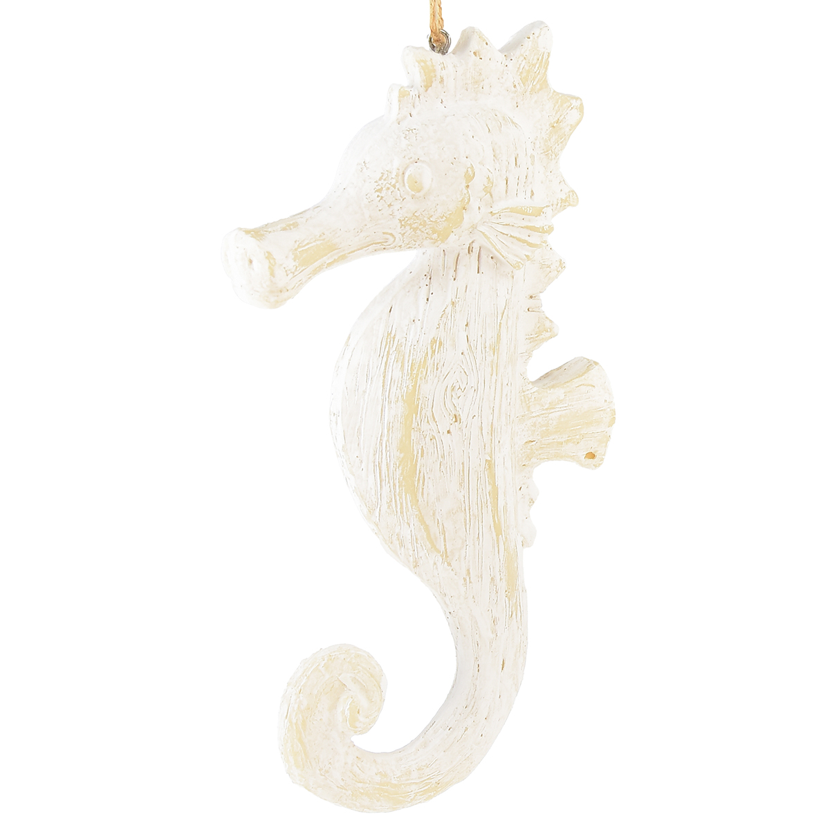 Die hübsche Seepferd-Hängedeko wirkt, als sei sie aus Holz geschnitzt, besteht aber aus Kunststoff und ist dabei im angesagten Shabby Chic gestaltet.