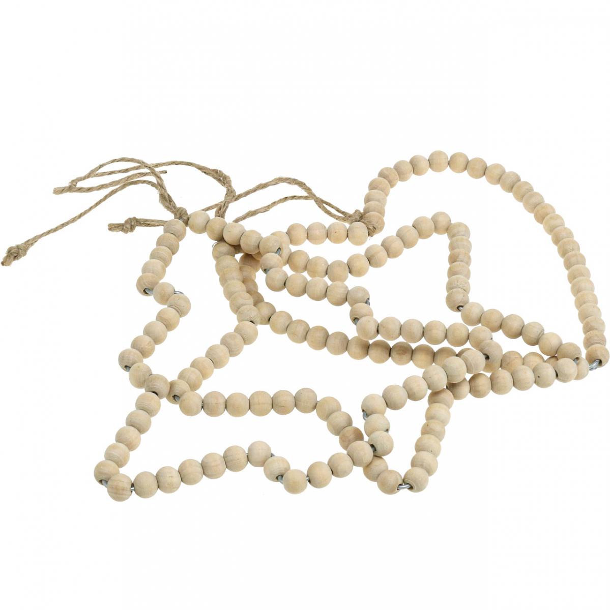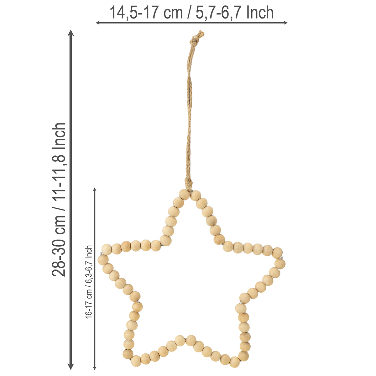 Die Perlen haben einen Durchmesser von etwa einem Zentimeter. Der Aufhänger besteht aus einer Kordel, die ebenfalls natürlich gehalten ist. Die Deko eignet sich wunderbar als Weihnachtsbaumschmuck, aber auch als Hängedeko oder Fensterdeko. Denn der Weihnachtshänger sieht durch die runden Holzperlen von allen Seiten gleich gut aus.