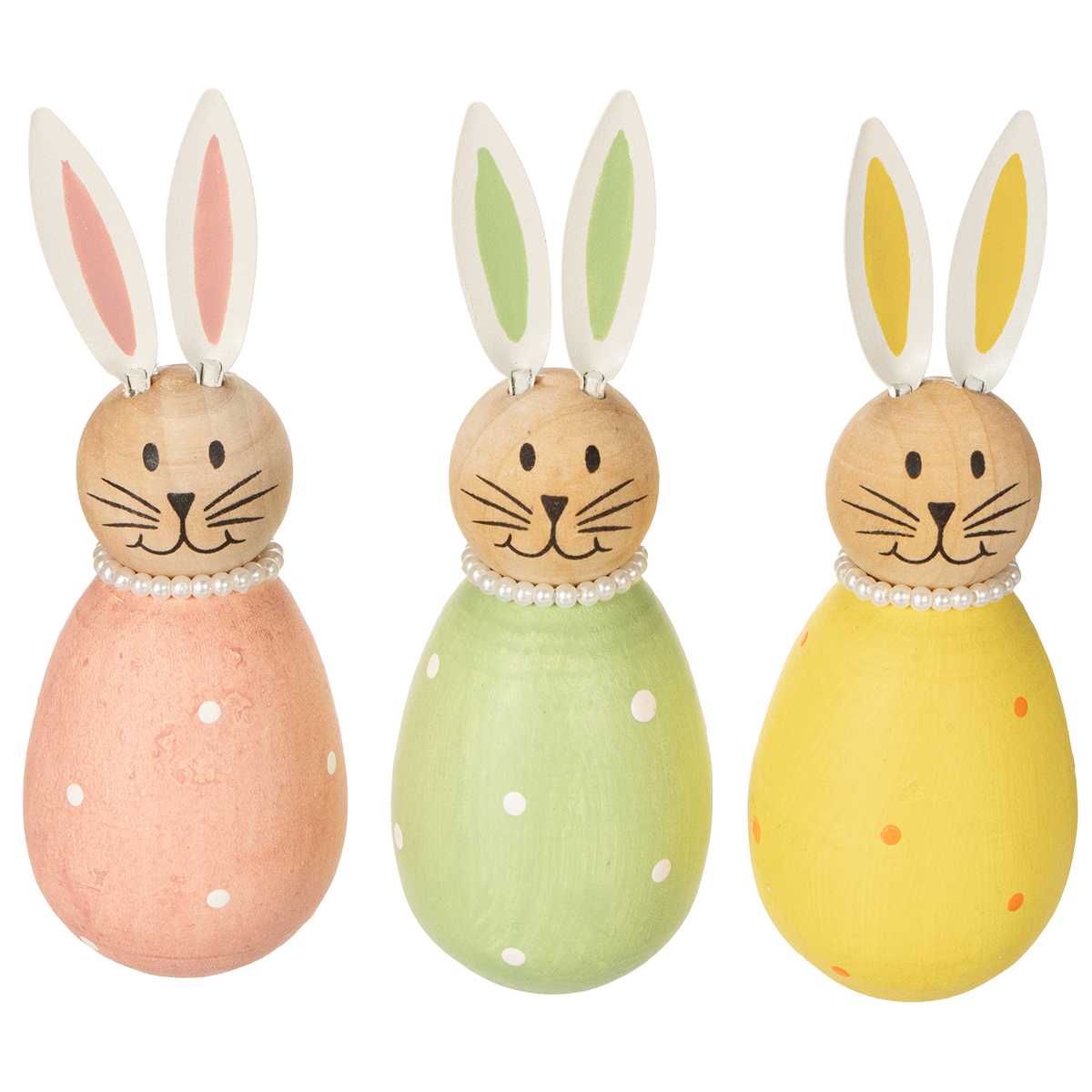Was gibt es Schöneres, als den Frühling mit einer charmanten Dekoration willkommen zu heißen? Diese dekorativen Hasenfiguren im Ei Design zaubern nicht nur ein Lächeln auf jedes Gesicht, sondern bringen auch eine fröhliche Frühlingsstimmung in Ihren Wohnraum. Egal ob auf der Fensterbank, dem Ostertisch oder im Regal – diese liebevoll gestalteten Dekofiguren ziehen alle Blicke auf sich. Mit ihren zarten Pastellfarben in Rosa, Gelb und Grün und den handbemalten Details verleihen sie Ihrem Zuhause eine warme und einladende Note. Die feinen Metallohren, die dezenten Punkte auf den Eierkörpern und die filigranen Perlenketten um den Hals – diese kleinen Details machen die Figuren zu etwas ganz Besonderem. Möchten Sie Ihren Räumen eine frühlingshafte Leichtigkeit schenken oder Ihre Osterdekoration aufwerten? Dann sind diese bunten Holzhäschen die perfekte Wahl!