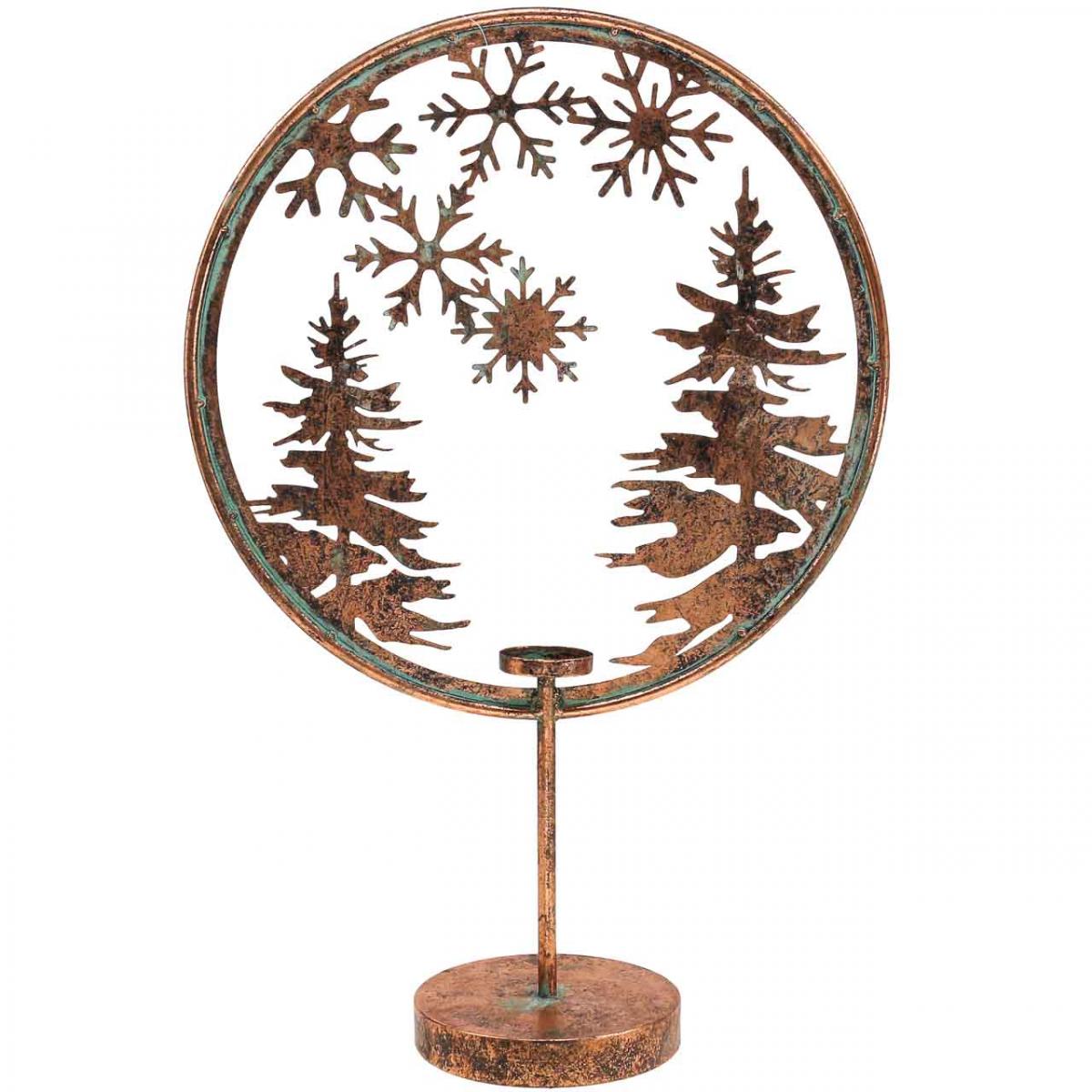 Wie ein Winter-Bild aus Metall präsentiert sich dieser Dekoring für Weihnachten. Große Schneeflocken fallen auf die beiden Tannenbäume. Umgeben ist die Landschaft von einem Metallring mit einem breiten runden Rand, der nach innen in das Bild hinein flach ausläuft und der Adventsdeko so im wahrsten Sinne des Wortes einen Rahmen gibt. Der Kerzenhalter hat einen wunderschln antik wirkenden Kupfer- beziehungsweise Bronze-Look.