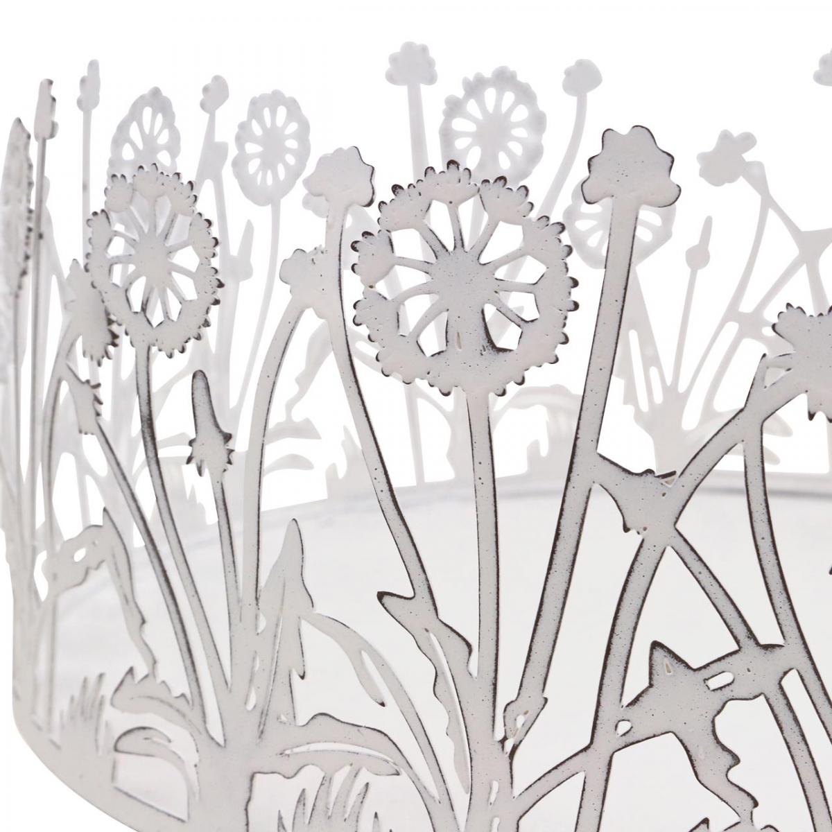 Produktname: Dekotablett mit Pusteblumen, Metalldeko für den Frühling Weiß, Silbern Shabby Chic Ø25cm H10,5cm