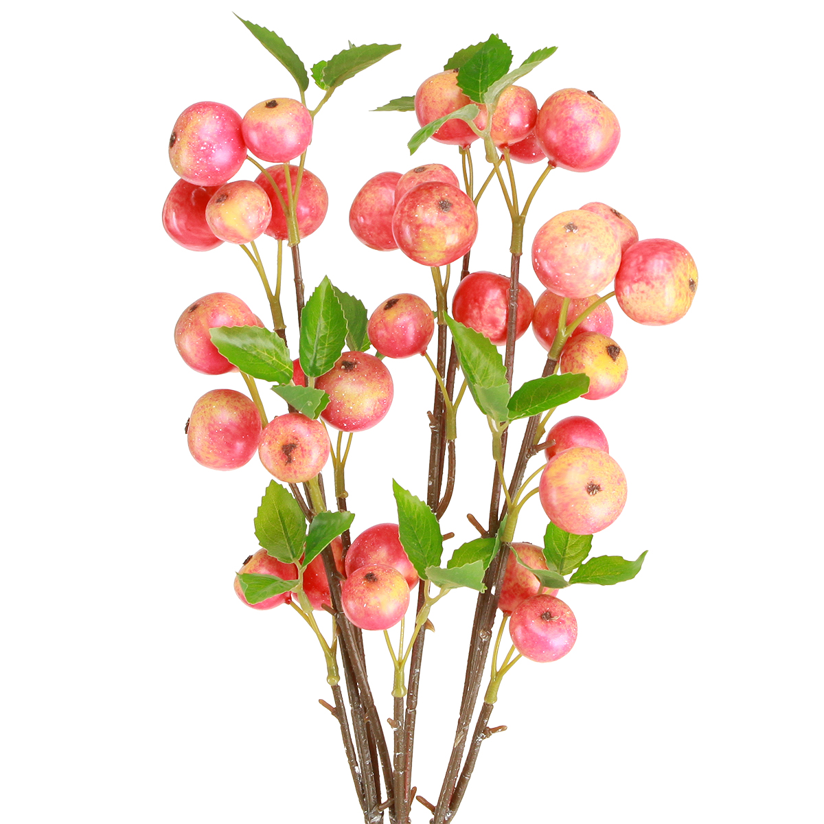 Diese liebevoll gestalteten Kunstzweige mit kleinen Zieräpfeln in lebhaften Gelb- und Rottönen fügen sich harmonisch in jede herbstliche Dekoration ein. Die Zieräpfel mit einem Durchmesser zwischen 2 und 3 cm präsentieren sich an fünf braunen Zweigen mit einem Metallkern, der für Stabilität und vielfältige Dekorationsmöglichkeiten sorgt. Grüne Blätter runden das naturnahe Design ab und machen die künstlichen Apfelzweige zu einer dauerhaften Dekoration ohne Pflegeaufwand.