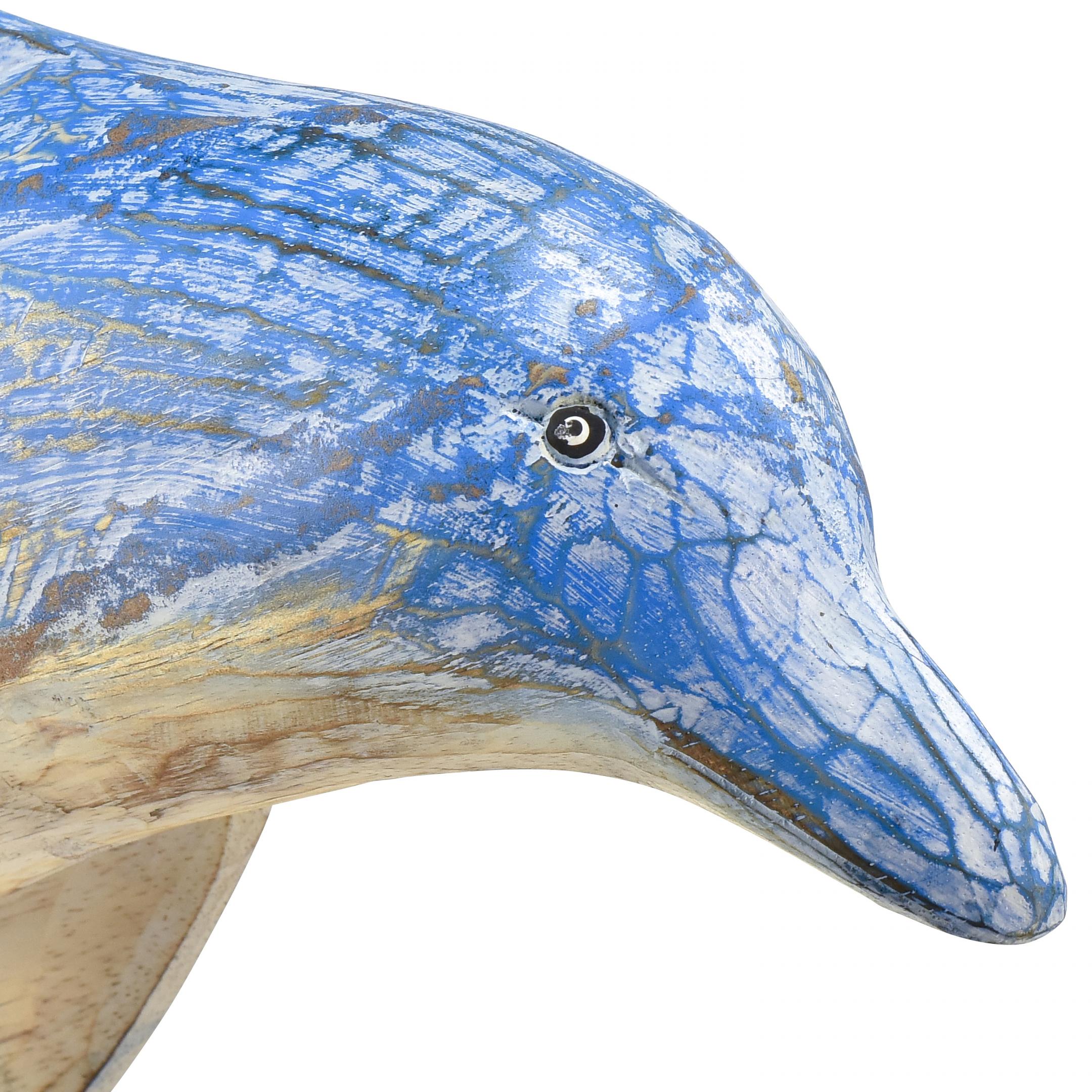 Die Delfin-Figur ist handgeschnitzt, der Körper blau bemalt und das Holz geweißt. Der Charme des Naturholzes bleibt aber immer erkennbar.