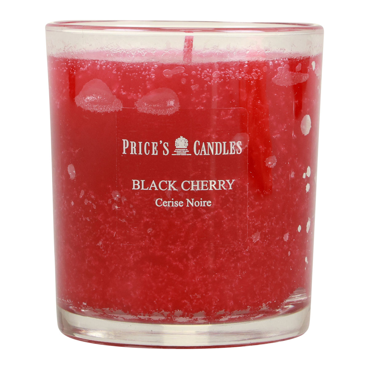 Die Duftkerze mit dem Kirsch-Parfüm von Price's Candles begeistert schon rein optisch durch das fruchtig rote Wachs im klaren Kerzenglas. Nach dem Anzünden erfüllt ein betörender Duft nach Sauerkirsche den Raum.
