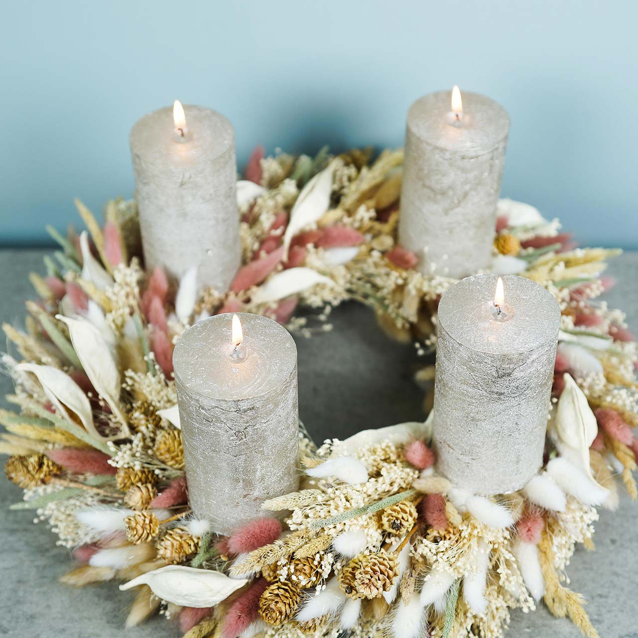 Lassen Sie sich von den Stumpenkerzen im metallischen Platin inspirieren und setzen Sie sie ganz jährlich in Ihre Dekorationen mit ein. Besonders an kalten und verschneiten Winterabenden können Sie sich von dem flackernden Kerzenlicht stimmungsvoll und harmonisch auf die bevorstehende Weihnachtszeit einstimmen lassen. Das leicht glänzende Platin der Kerzen lässt sich mit klassischem Tannengrün, etwas Kunstschnee und elegant verziert mit silbernen Kugeln sowie glitzernden Accessoires besonders gut auf einem Adventskranz oder einem weihnachtlichen Gesteck arrangieren. Auch eignen die Stumpenkerzen sich gut für eine edle und elegant zurückhaltende Tischdekoration für Hochzeiten und andere festliche Veranstaltungen. Kreieren Sie zauberhafte wie noble Dekorationen mit den Premiumkerzen in Platin!