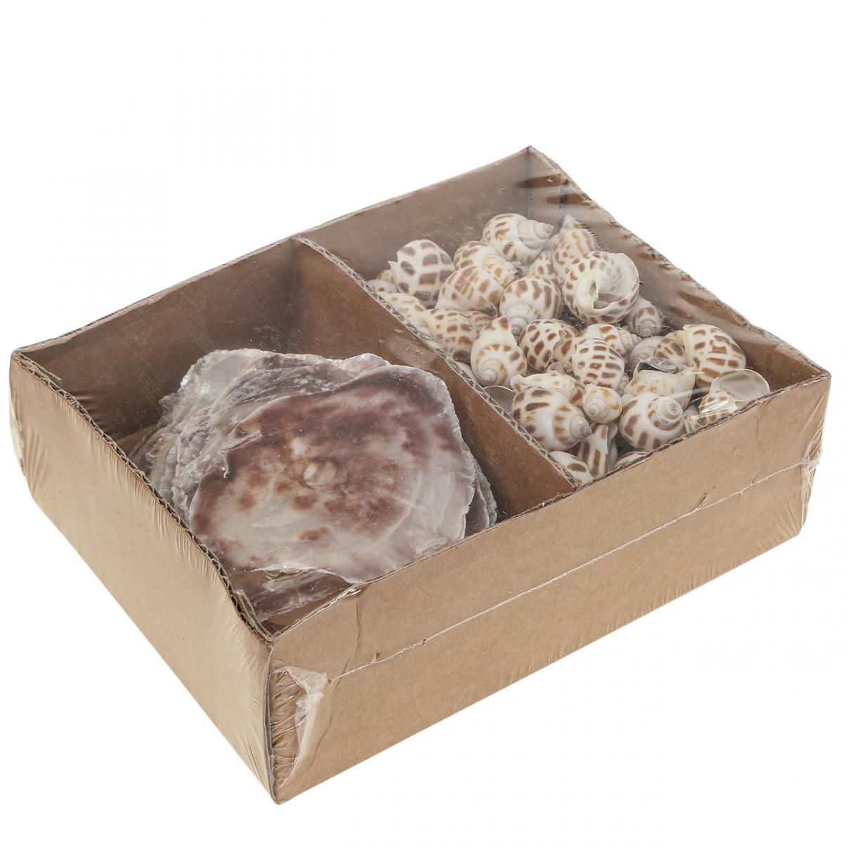 Sie erhalten die Dekomuscheln in einer gemischten Pappschachtel mit Trennwand zu etwa 400 Gramm Nettogewicht.