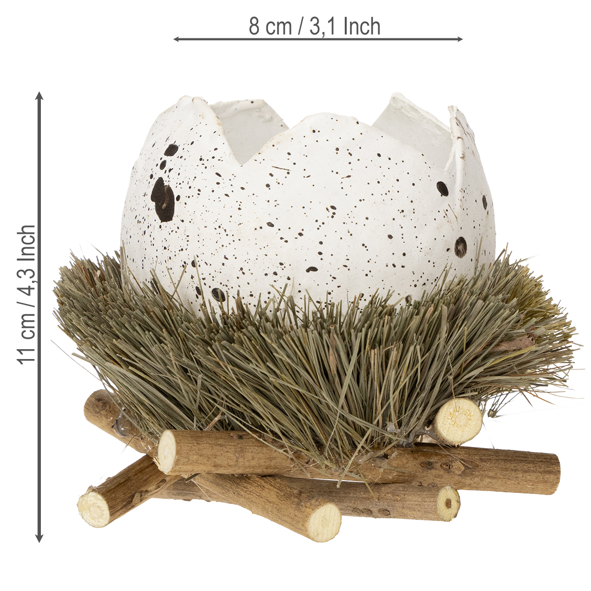 Die Eihälfte im Nest besitzt einen Durchmesser von circa 9 Zentimetern und die Deko ist etwa 11 Zentimeter hoch. Die gezackte Öffnung an der Oberseite der Eideko beträgt an der schmalsten Stelle ungefähr 6 Zentimeter im Durchmesser.