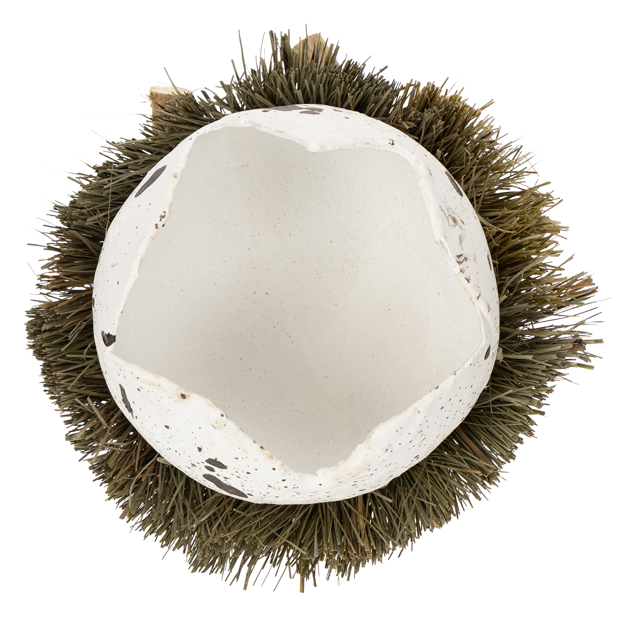 Das weiße Deko-Ei mit braunen Sprenkeln befindet sich in einem Bett aus echtem getrockneten Gras, das sich auf einem Kranz aus kleinen Holzscheiten befindet. – Somit sieht das Ganze nicht nur aus wie ein echtes Vogelnest, das man so in der Natur finden könnte, sondern steht auch sicher und stabil.