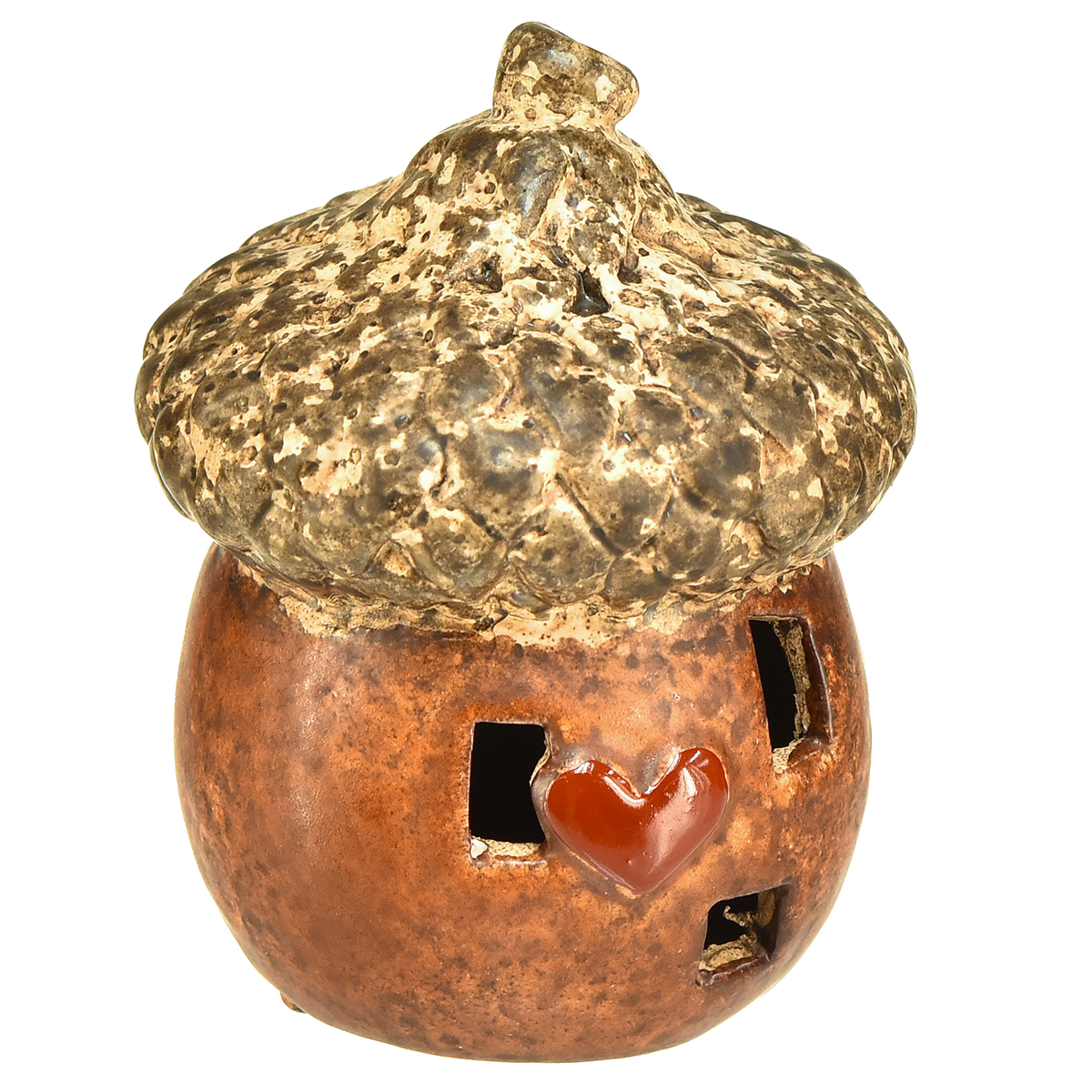 Die Eicheln sind aus hochwertigen Materialien gefertigt und überzeugen mit detailreichen Fenstern und einer lieblichen Herzdeko. Die antik wirkende Patina des Eicheldaches harmoniert perfekt mit der warmen Erdton-Palette, die an gemütliche Herbsttage erinnert, während die Herzfenster eine atmosphärische Beleuchtung ermöglichen – ein Traum für gemütliche Herbstdeko Eichel Liebhaber.